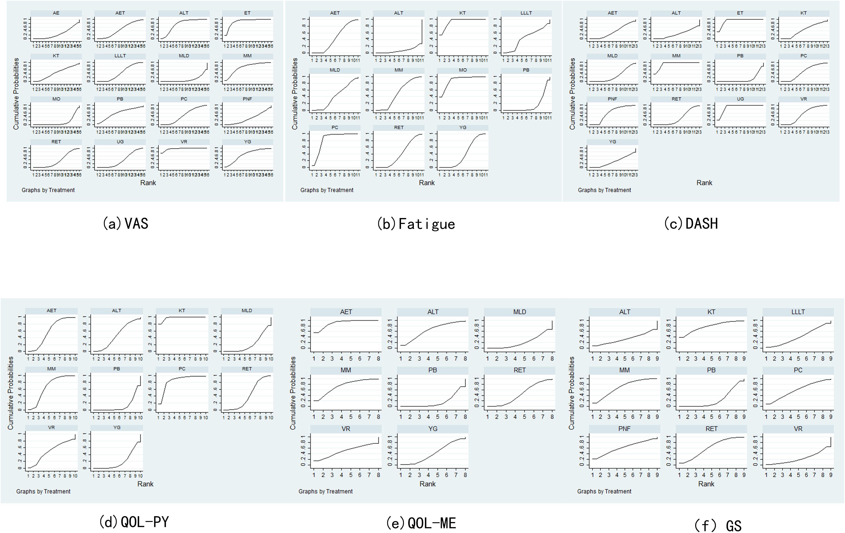 Six panels labeled (a) VAS, (b) Fatigue, (c) DASH, (d) QOL-PY, (e) QOL-ME, and (f) GS, each showing multiple line graphs. Graphs depict cumulative probabilities versus rank across different treatments, labeled such as AET, ALT, ET, and more. Patterns indicate varied treatment outcomes for different measures.