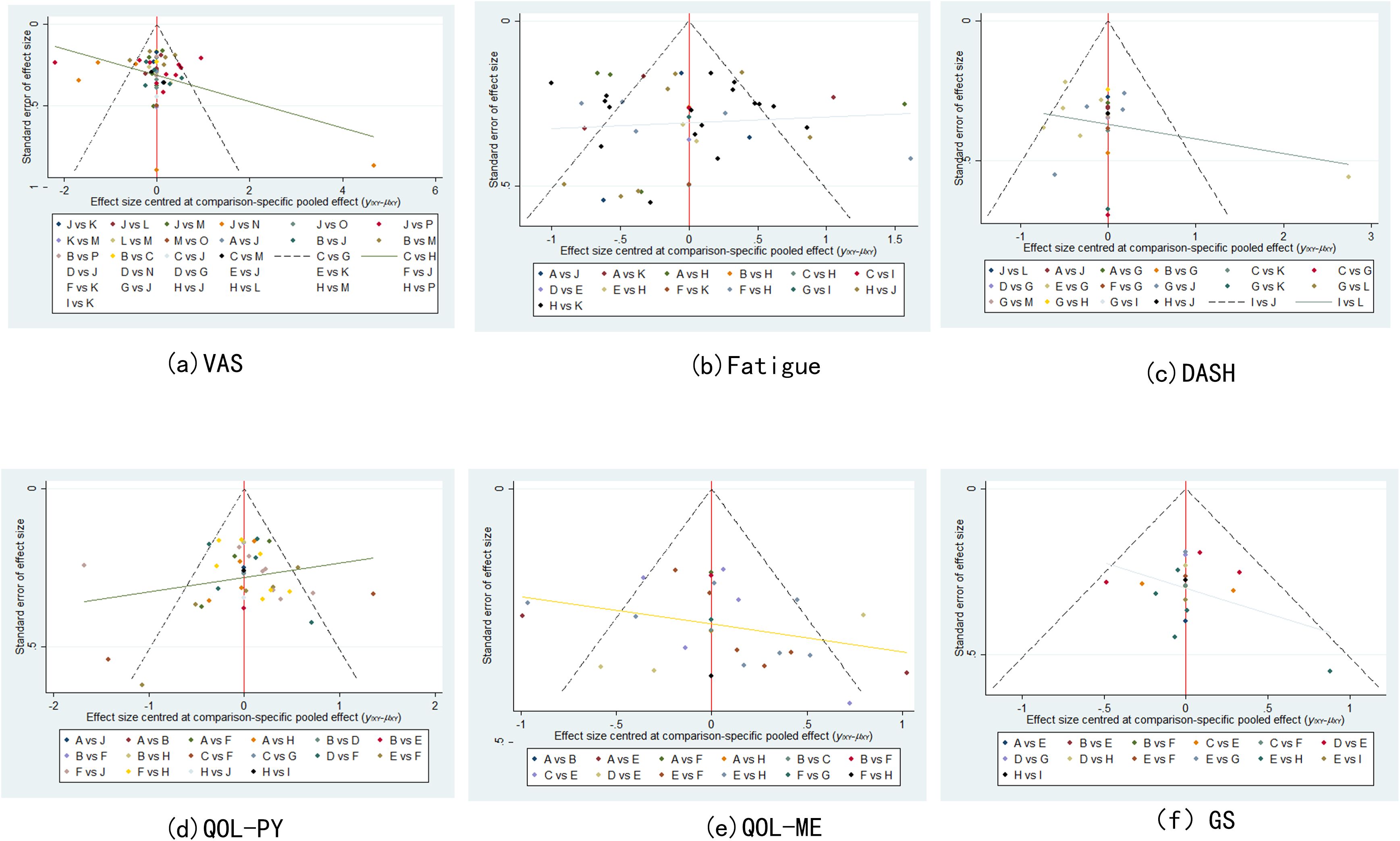 Six funnel plots showing effect size centered at comparison-specific pooled effect versus standard error of effect size for different metrics: (a) VAS, (b) Fatigue, (c) DASH, (d) QOL-PY, (e) QOL-ME, and (f) GS. Each plot includes various data points represented by different colored dots and a reference line. The x-axis is labeled “Effect size centered at comparison-specific pooled effect,” and the y-axis is labeled “Standard error of effect size.