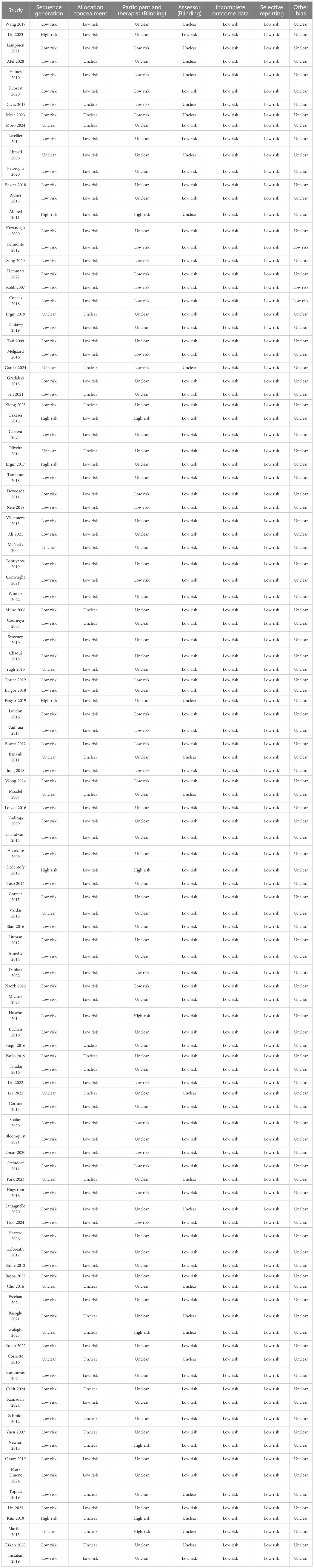 A total of 111 randomized controlled trials were included in the analysis, with a total of 6,888 participants from 22 countries. The 111 studies comprised 16 distinct interventions: aquatic exercise, aerobic exercise, aqua lymphatic therapy, electrotherapy, kinesio taping, low level laser therapy, manual lymphatic drainage, mixed motion, moxibustion, pneumatic circulation, proprioceptive neuromuscular facilitation, resistance exercise, virtual reality, yoga and ultrasound therapy. The fundamental characteristics of the included studies are delineated in Table 1. The Cochrane systematic review of interventions described the evaluation of randomized controlled trials on seven aspects associated with the risk of bias (see Table 2). Please refer to Appendix for the CINeMA Network Meta-online evaluation.