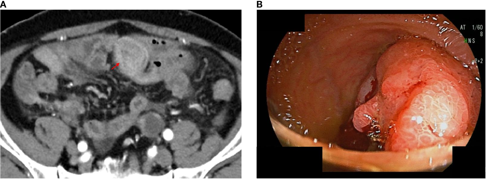 Figure 1. Computed tomography (CT) and endoscopic images of unresectable Meckel’s diverticulum cancer. CT images performed at our hospital; the arrow indicates an enhanced mass lesion in the ileum (a). Double-balloon endoscopic finding of Meckel’s diverticulum cancer (b).