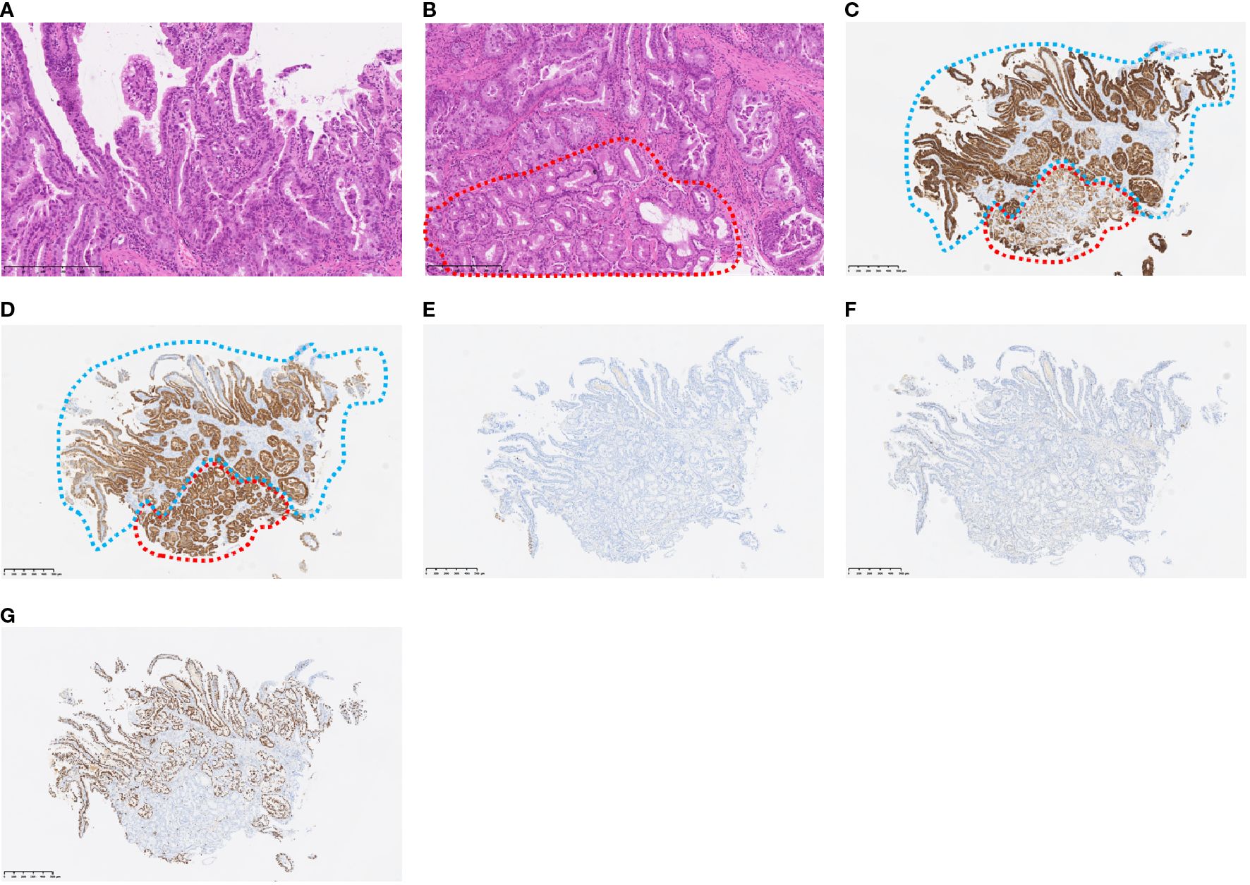 Figure 2. Histopathological findings at the tumor sites. The histological type of the tumor is well-differentiated carcinoma (H&E staining) (a) Non-tumor cells (within the red line) are in contact with the tumor cells (H&E staining) (b) Immunohistochemical staining of MUC5AC (c), MUC6 (d), MUC2 (e), and CDX2 (f) Non-tumor cells (red dotted line) were positive for MUC5AC and MUC6, but negative for MUC2 and CDX2, indicating the presence of gastric epithelium. Tumor cells (blue dotted line) were also positive for MUC5AC and MUC6 and negative for MUC2 and CDX2, indicating gastric phenotype. Immunohistochemical staining of Ki-67, revealing 70% Ki-67-positive tumor cells, suggestive of a highly proliferative cancer type (g).