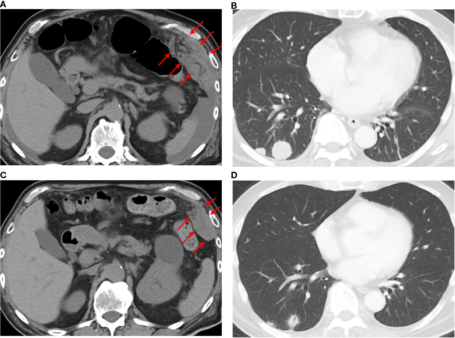 Figure 4. Computed tomography findings before and after the administration of zolbetuximab-based chemotherapy. CT images before treatment (a, b) and 2 months after zolbetuximab-based chemotherapy (c, d). Red arrows indicate peritoneal disseminated nodules.