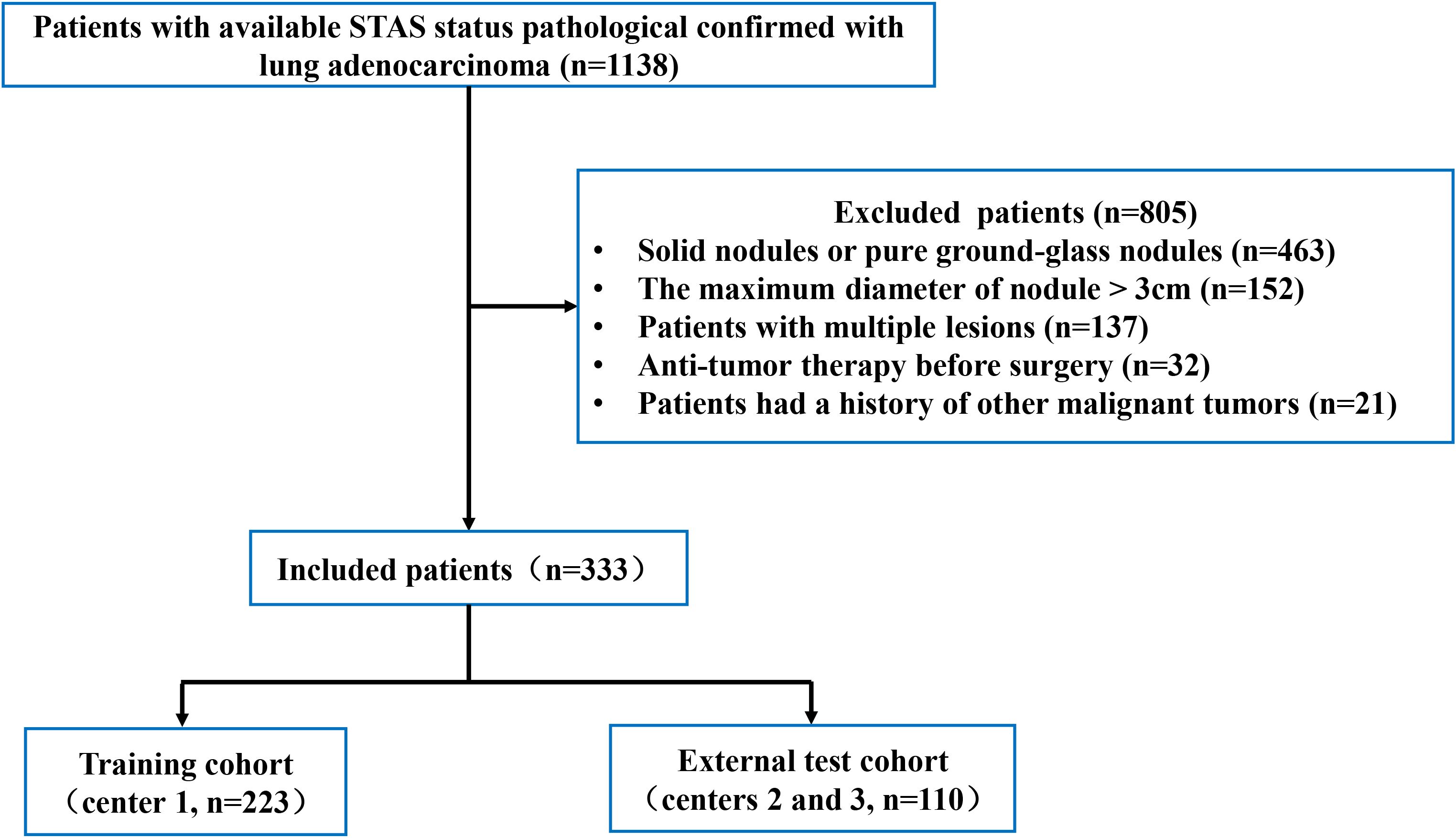 Flowchart depicting the selection process for patients with confirmed lung adenocarcinoma and available STAS status. Starting from 1138 patients, 805 are excluded due to certain conditions, leaving 333 included patients. These are divided into a training cohort of 223 patients from one center, and an external test cohort of 110 patients from two other centers.