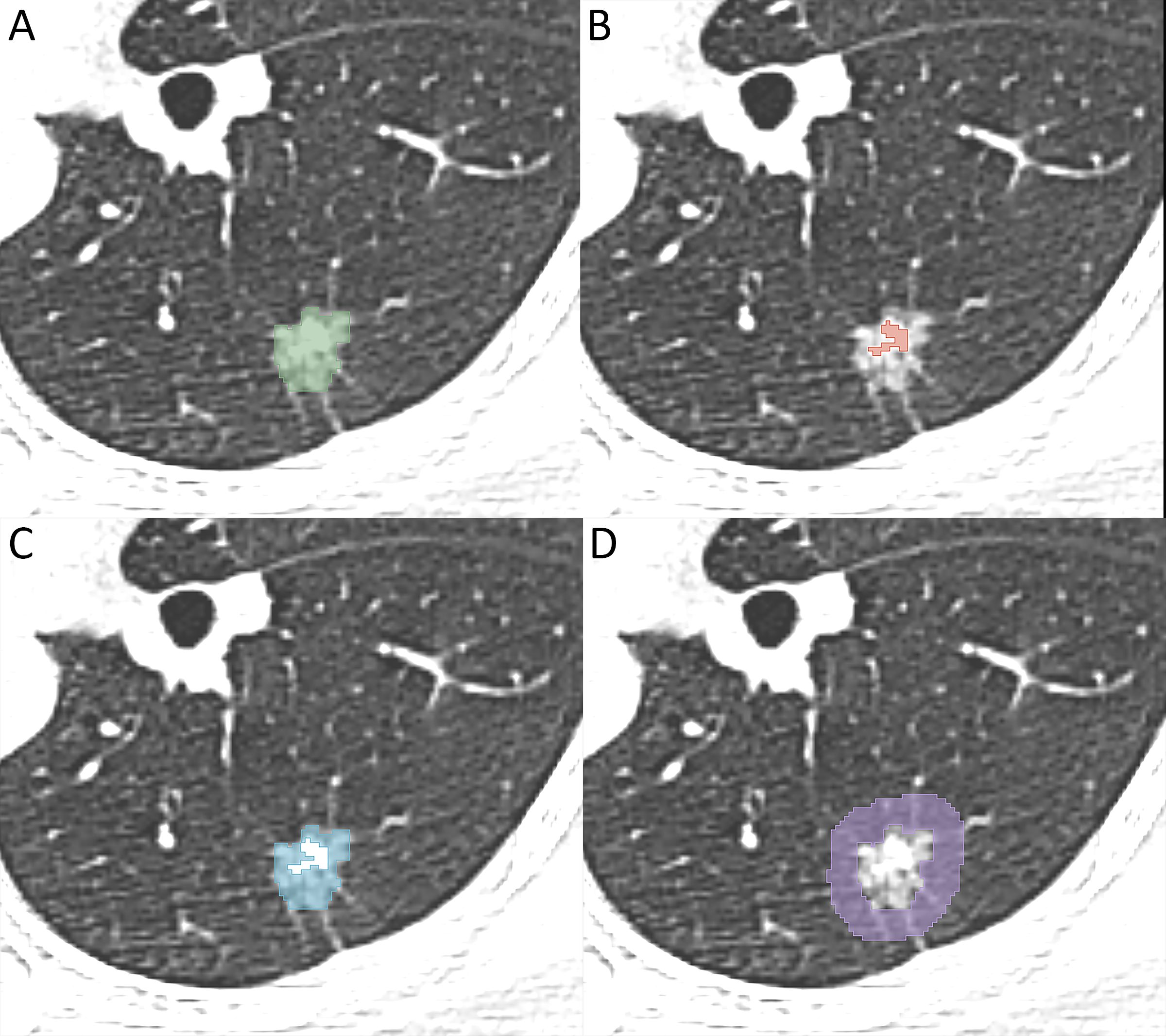 Figure 2. Image illustrates segmentation of different region of interest. (A) the gross nodule region, (B) the solid region, (C) the ground-glass opacity region, (D) the perinodular region.