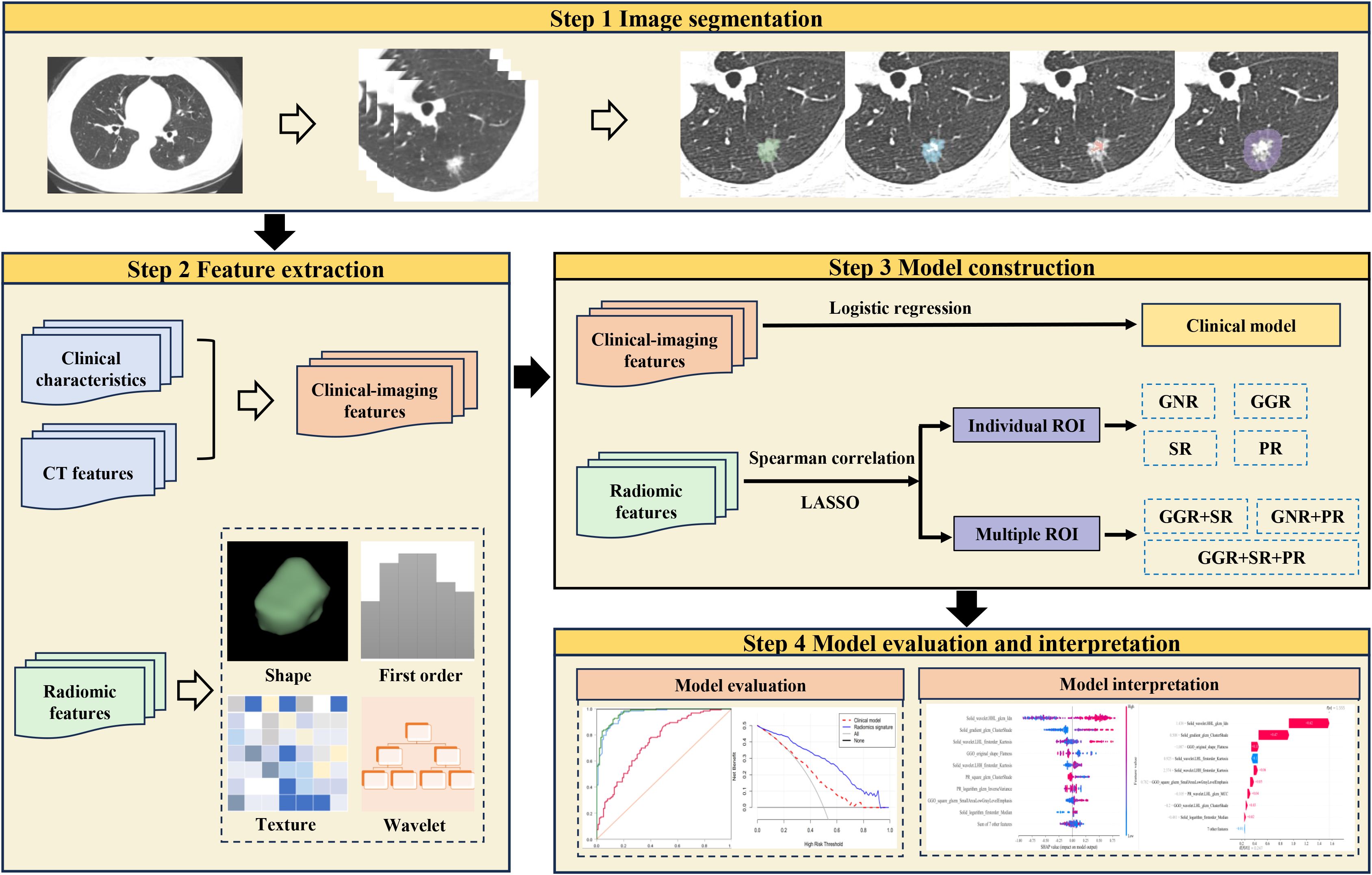 Step 3: Model construction using clinical-imaging features and radiomic features with logistic regression and LASSO techniques,respectively, resulting in models like GNR, GGR, SR, and PR. Step 4: Model evaluation and interpretation with graphs and analysis of prediction performance and feature significance.