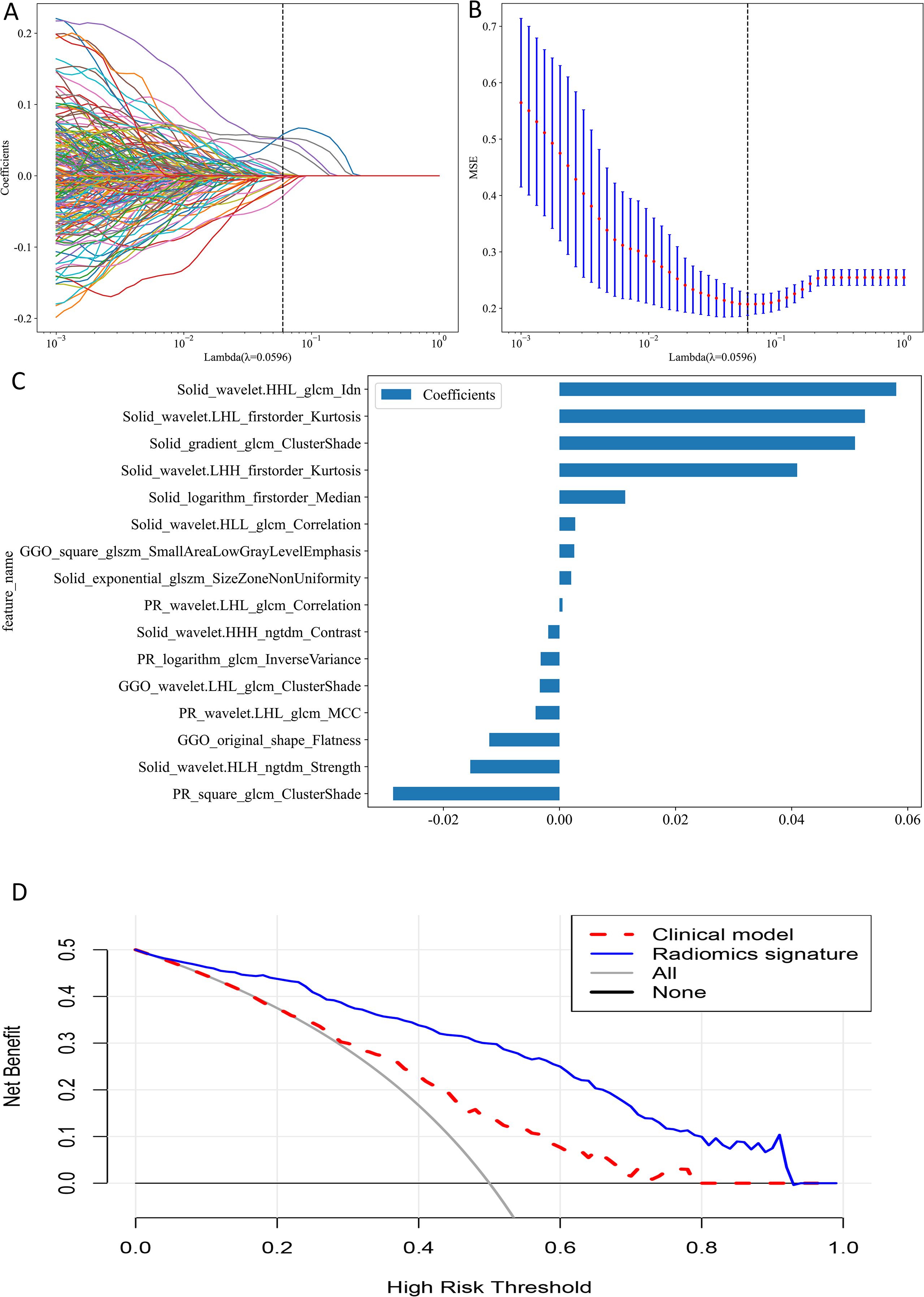 Composite image featuring four graphs related to statistical analysis. Graph A shows coefficient paths against lambda values using colored lines. Graph B displays mean squared error (MSE) against lambda, illustrating an optimal lambda with vertical dashed line. Graph C is a bar chart of coefficients for various features, with values ranging from negative to positive. Graph D is a decision curve analysis showing net benefit across different high-risk thresholds, comparing clinical and radiomics models.