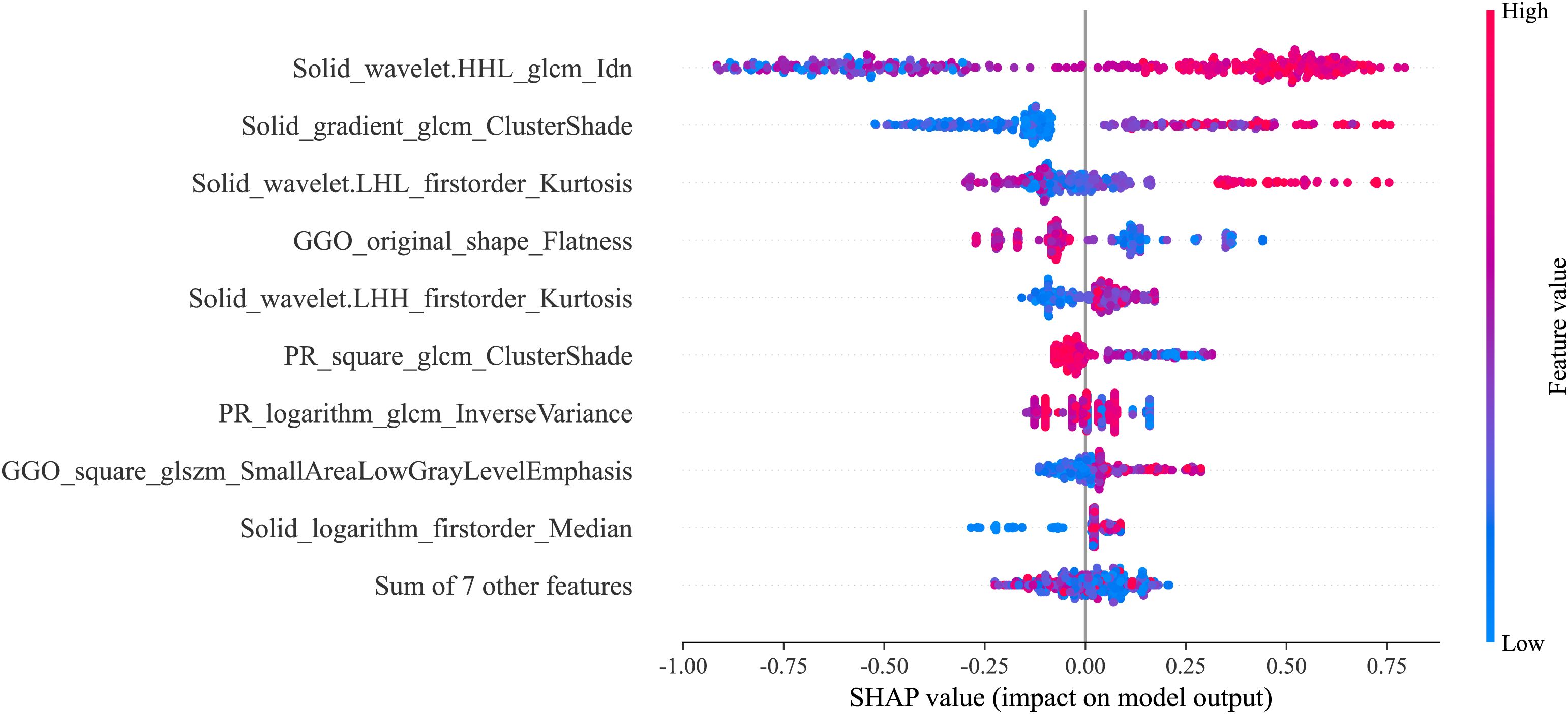 Radiomics analysis using quantitative features extracted from medical images allows precise and detailed evaluation of lesions, including the presence of tumor heterogeneity (20). Several studies (2124) have used radiomics method to assess STAS status in lung adenocarcinoma, and these have achieved good diagnostic performance. However, their study failed to offer a detailed analysis of lung adenocarcinoma with PSNs. Additionally, because of unclear internal mechanisms that limit transparency and credibility, the application of such models in clinical practice may be restricted (25). Shapley Additive exPlanations (SHAP) is a unified structure based on additive feature mapping techniques that consider the predictions of complex models (26). It can explain the importance of features and assist in comprehending the function of each feature in making predictions for both the entire dataset and specific samples (27). By combining radiomics and SHAP, it is possible to build a model that explains the prediction in an understandable way (28, 29).