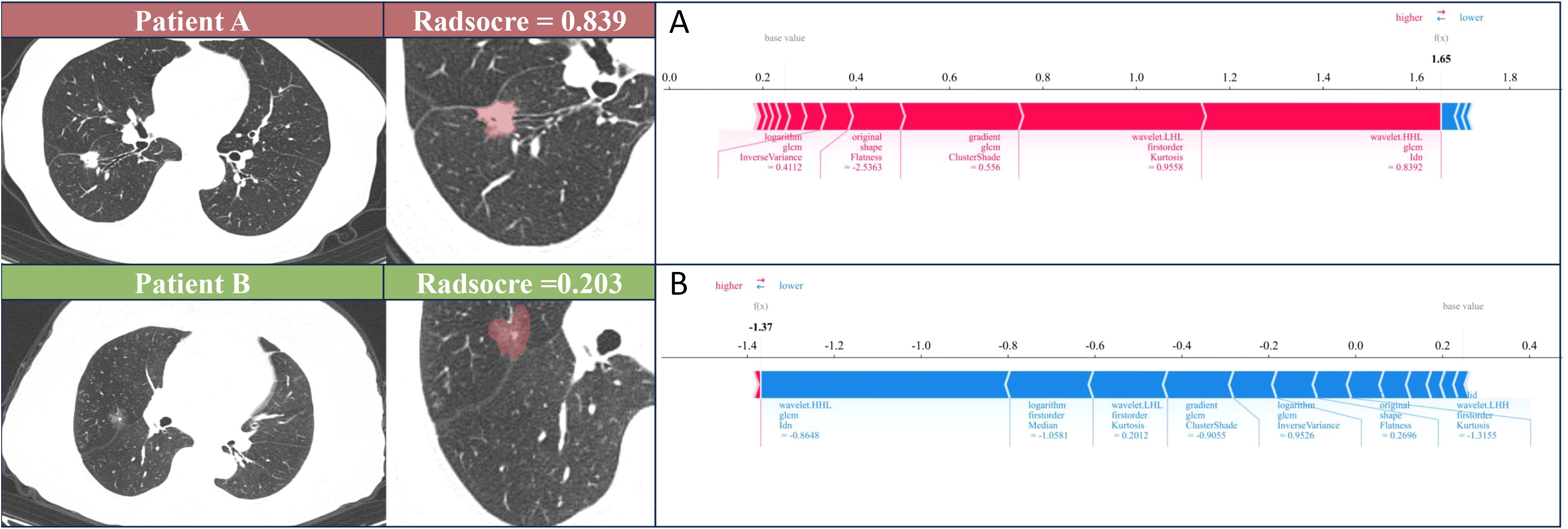 CT scans of lungs for Patients A and B, showing tissue highlights. Patient A has a Radscore of 0.839. Patient B has a Radscore of 0.203. Next to each scan, a graph displays radiomic feature contributions with red indicating a higher impact for Patient A and blue for Patient B.