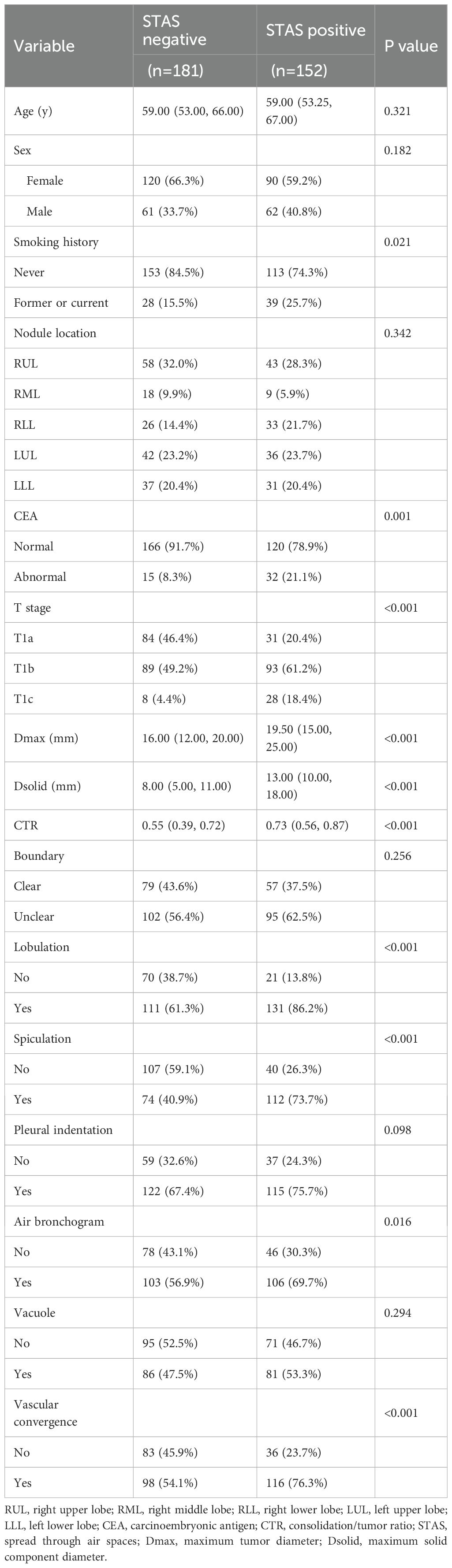 Table 1 provides details on the clinical and CT features of the patients. Among 333 patients with lung adenocarcinoma, 152 cases were STAS-positive, and 181 were STAS-negative. There were 210 women and 123 men, ranging in age from 29 to 83 years.