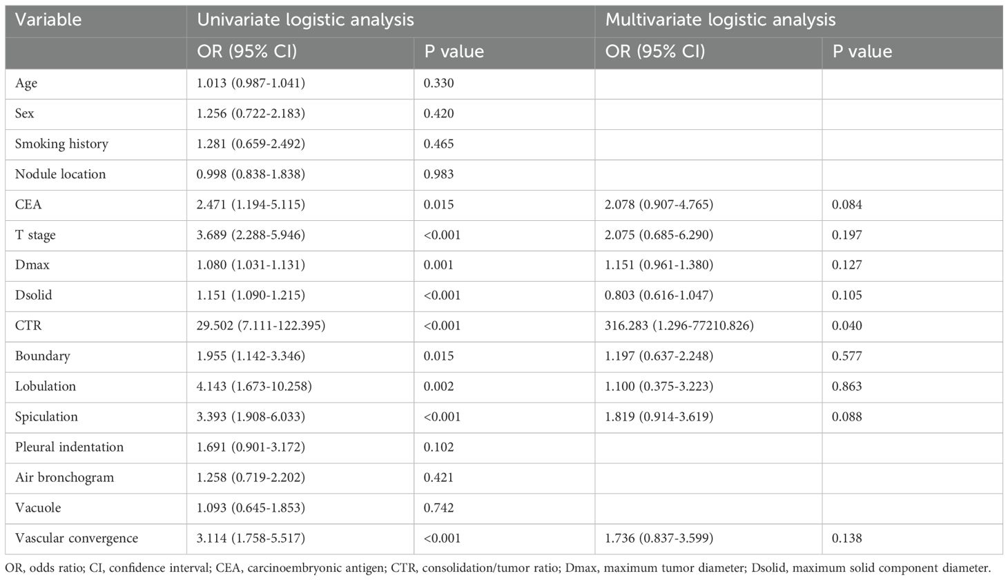 Univariate logistic regression analysis was used to identify variables associated with STAS status. Variables with P < 0.05 were further analyzed using multivariate logistic regression analysis. Variables yielding P < 0.05 in the multivariate analysis were deemed independent predictors of STAS. Using these significant variables, a clinical model was developed.