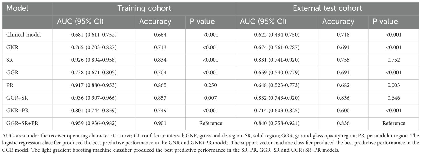 Previous studies have used radiomics to assess STAS. Jiang et al. (21) built a CT-based radiomics signature using the random-forest classifier that predicted STAS with a specificity of 0.588, sensitivity of 0.880, and AUC of 0.754, demonstrating good diagnostic capability. However, this study was a single-center study. Chen et al. (34) extracted radiomic features from 233 stage I lung adenocarcinoma and constructed a CT-based predictive model for STAS that achieved AUCs of 0.63 and 0.69 in the internal and external validation cohorts, respectively. However, this model showed moderate predictive performance. Moreover, these studies only extracted radiomic features from the gross tumor region. In our study, we extracted radiomic features from different regions of nodules, and found that the radiomics model based on combined features from GGR, SR, and PR showed good discrimination ability (AUC = 0.840) and was the best-performance model. By analyzing these radiomic features, we observed that the predictive performance of the GGR+SR model (AUC = 0.832) outperformed the GNR model (AUC = 0.674) when applied to the external test cohort. This result may indicate that the combined features of GGR and SR had additional value compared with the GNR features alone. Additionally, we also found that the predictive performance of the SR model (AUC = 0.831) was superior to that of the GGR model (AUC = 0.659) and GNR model (AUC = 0.674). Radiomics can reflect the heterogeneity of tumors, this result demonstrates that radiomic features from SR were useful in predicting STAS, reflecting the relationship between STAS and the solid components of the tumor. STAS is mainly distributed around the primary tumor lesion, and studies (23, 35) have demonstrated that radiomic features extracted from the peritumoral area were feasible for predicting STAS status. In our study, the prediction performance of the model was improved when combined radiomic features from SR, GGR and PR, indicating PR features had a certain predictive value.