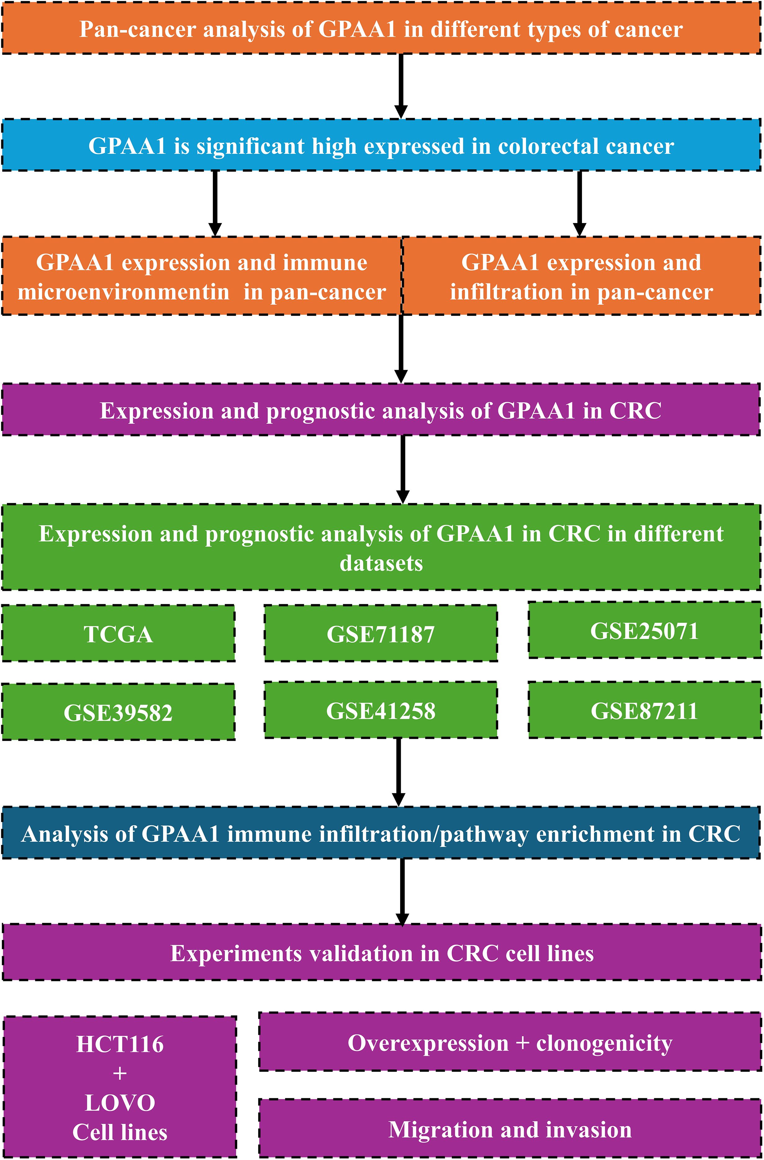 Figure 1. Provides an overview of the study. We first performed a pan-cancer analysis that highlighted the potential role of GPAA1 in colorectal cancer, then interrogated multiple databases to evaluate GPAA1 in CRC, and finally validated the findings using in vitro experiments.