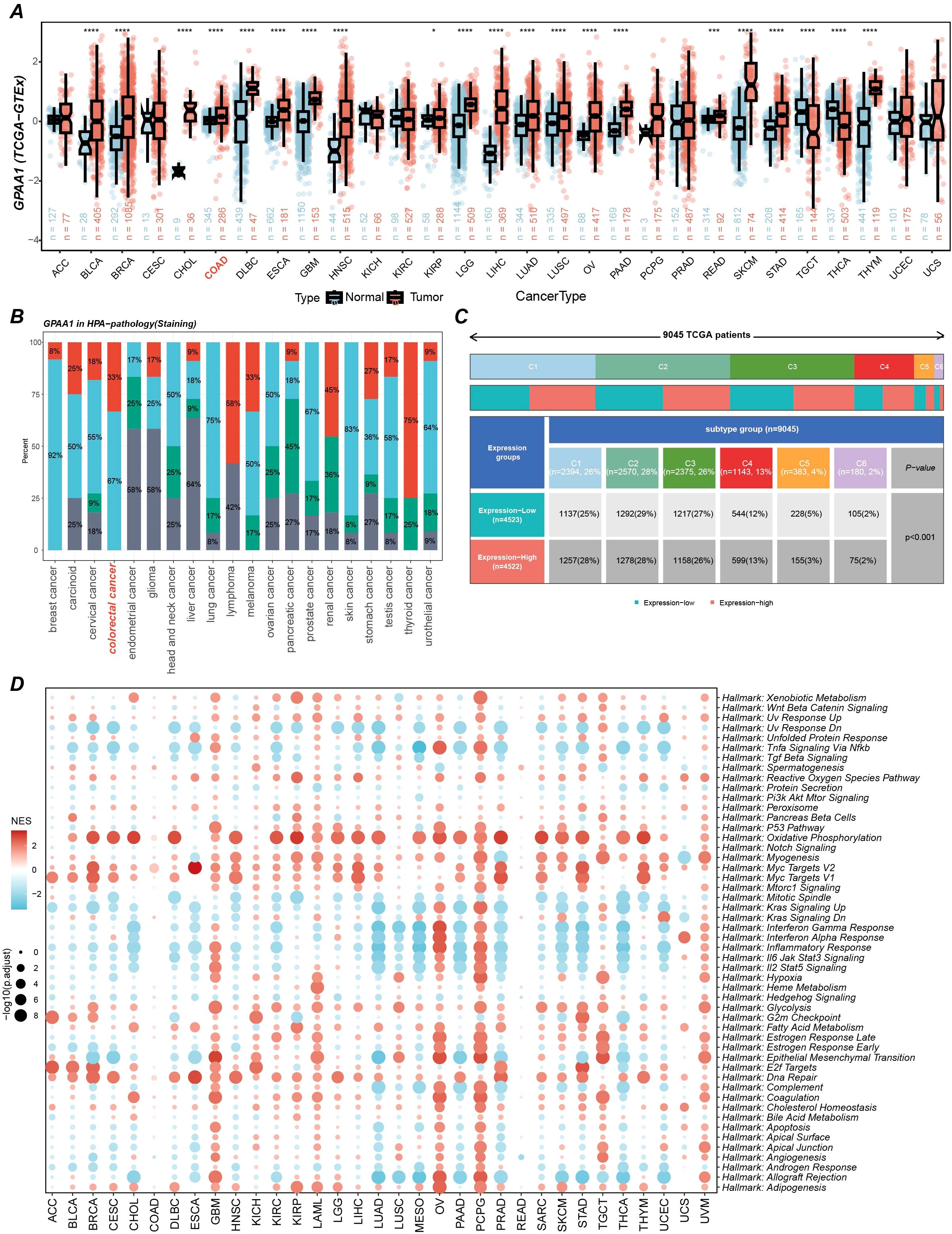 Figure 2. Pan-cancer GPAA1 expression, immune infiltration, and pathway analyses. (A) Differences in GPAA1 mRNA expression in the TCGA + GTEx pan-cancer cohort. (B) GPAA1 protein staining levels in different cancer types from the HPA pathology dataset. Colors represent staining intensity: red = high, light blue = medium, green = low, gray = not detected. Percentages indicate the proportion of samples in each category. (C) Immune-subtype composition differences between GPAA1-high and GPAA1-low groups in the pan-cancer cohort; colors indicate immune subtypes: C1 (wound healing), C2 (IFN-γ dominant), C3 (inflammatory), C4 (lymphocyte-depleted), C5 (immunologically quiet), C6 (TGF-β dominant). (D) Hallmark pathway enrichment analysis of GPAA1 in the pan-cancer cohort. * p <0.05, *** p <0.001, **** p <0.0001.