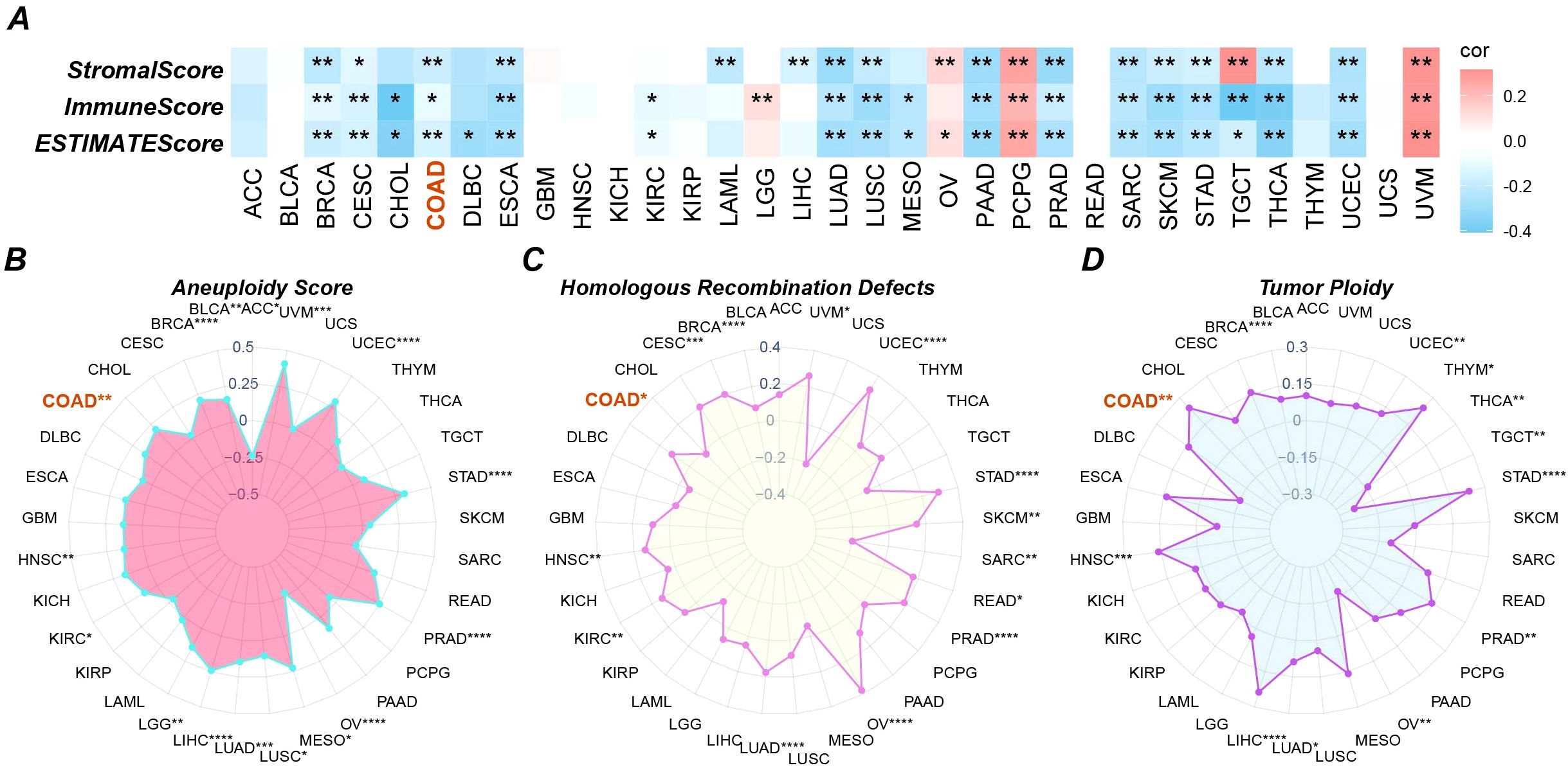 Aneuploidy reflects chromosomal numerical abnormalities, often leading to genomic instability and aggressive tumor behavior. HRD indicates impaired DNA repair capacity, which can confer sensitivity to PARP inhibitors. Tumor Ploidy describes the number of chromosome sets in a cell, with abnormalities suggesting dysregulated cell division. To further validate the immune regulatory role of GPAA1 and its association with genomic instability, analyses of immune scores and genetic mutations were conducted. Regarding immune scoring, analysis using the TCGAplot package (Figure 4A) revealed that high GPAA1 expression was significantly negatively correlated with ImmuneScore, StromalScore, and ESTIMATEScore. This finding further confirms GPAA1’s role in promoting a cold tumor microenvironment. In terms of genetic mutation characteristics, GPAA1 expression was positively correlated with aneuploidy (Figure 4B), HRD (Figure 4C), and tumor ploidy (Figure 4D) (p < 0.05), with these associations being particularly pronounced in CRC. The positive correlation between GPAA1 expression and these markers suggests that GPAA1 may promote CRC progression by driving genomic instability, thereby accelerating tumor evolution and therapeutic resistance. For example, HRD may increase tumor sensitivity to PARP inhibitors, offering a potential therapeutic target for CRC.
