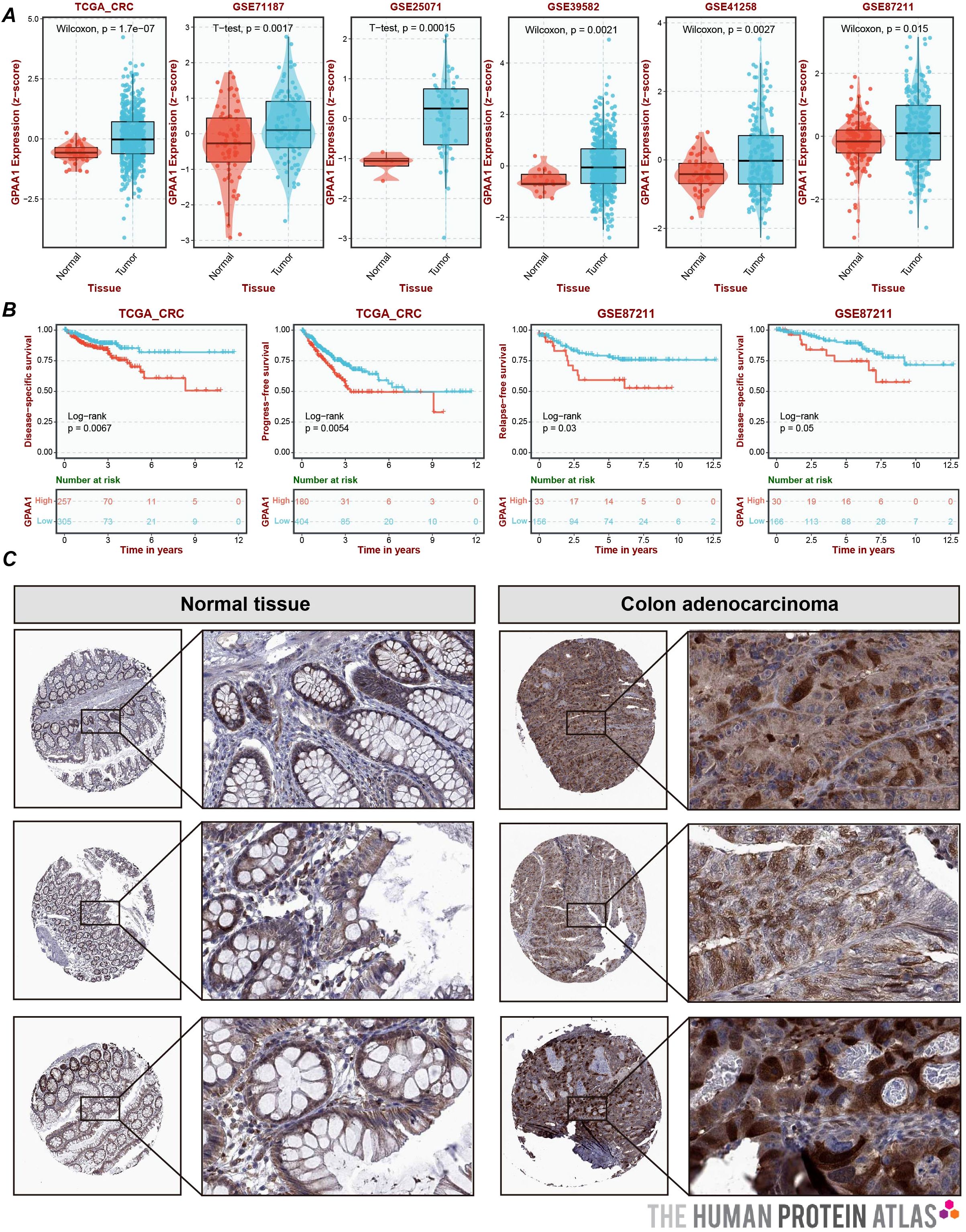 We conducted an integrated analysis of six colorectal cancer cohorts from TCGA and GEO to compare GPAA1 mRNA expression and to evaluate prognostic relevance. The TCGA-CRC, also referred to as COADREAD, comprises RNA-seq profiles from tumors and matched adjacent normal tissues and includes clinical annotation across stages I to IV. GSE71187 encompasses specimens from multiple developmental and pathological stages, including embryonic colons (3–22 postovulatory weeks), normal colorectal mucosae, adenomas, and carcinomas, providing insights into gene expression changes from development to malignancy. GSE25071 compares early-onset (mean age 43 years) and late-onset (mean age 79 years) colorectal cancers, with careful matching of clinicopathological parameters and exclusion of hereditary syndromes. GSE39582 is a large-scale cohort (443 tumors, 19 normals) used to define six molecular subtypes of colon cancer associated with distinct biological processes and survival outcomes. GSE41258 includes primary adenocarcinomas, adenomas, metastases, and matched normal mucosae collected at Memorial Sloan Kettering Cancer Center between 1992 and 2004, enabling investigation of tumor progression. GSE87211 consists of 243 rectal cancer samples profiled by expression microarrays and germline Single Nucleotide Polymorphism(SNP) arrays, linking colorectal cancer risk loci (8q24, 18q21, 20q13) to prognosis and chemoradiotherapy resistance. Collectively, these datasets provide a multifaceted resource spanning colorectal development, age-of-onset differences, molecular subtypes, tumor evolution, and treatment response, and used the KM curve of the Log-rank algorithm to associate GPAA1 expression with clinical prognosis (9). Representative immunohistochemistry images for colorectal cancer and normal colon were retrieved from the Human Protein Atlas to provide qualitative validation of GPAA1 protein expression.