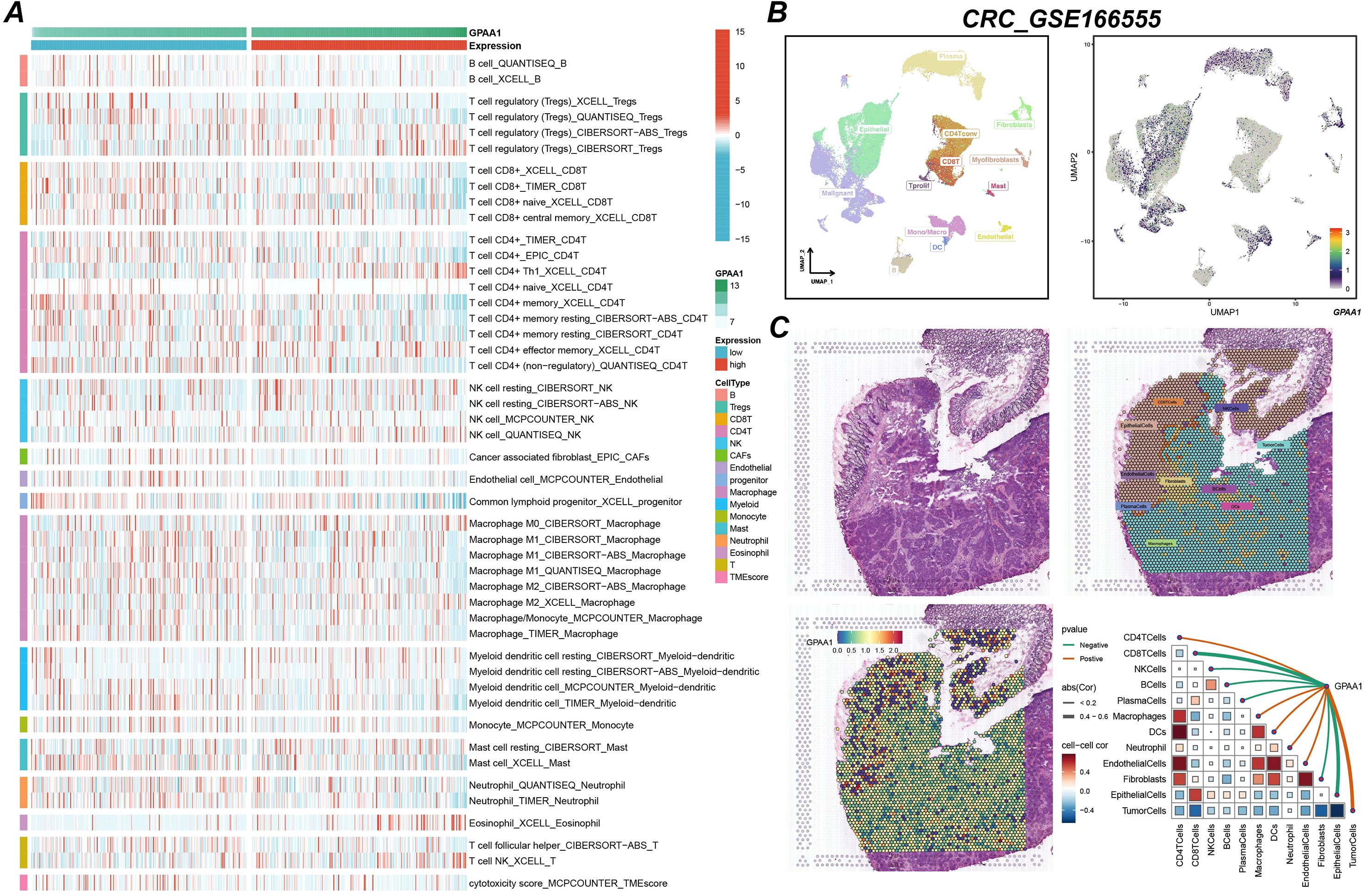 Figure 6. Analysis of GPAA1 immune infiltration in CRC. (A) Differences in immune cell infiltration between high and low GPAA1 expression groups; (B) single-cell sequencing analysis of cell subtypes with high GPAA1 expression; (C) spatial transcriptome analysis of GPAA1 expression distribution and its association with immune infiltration.