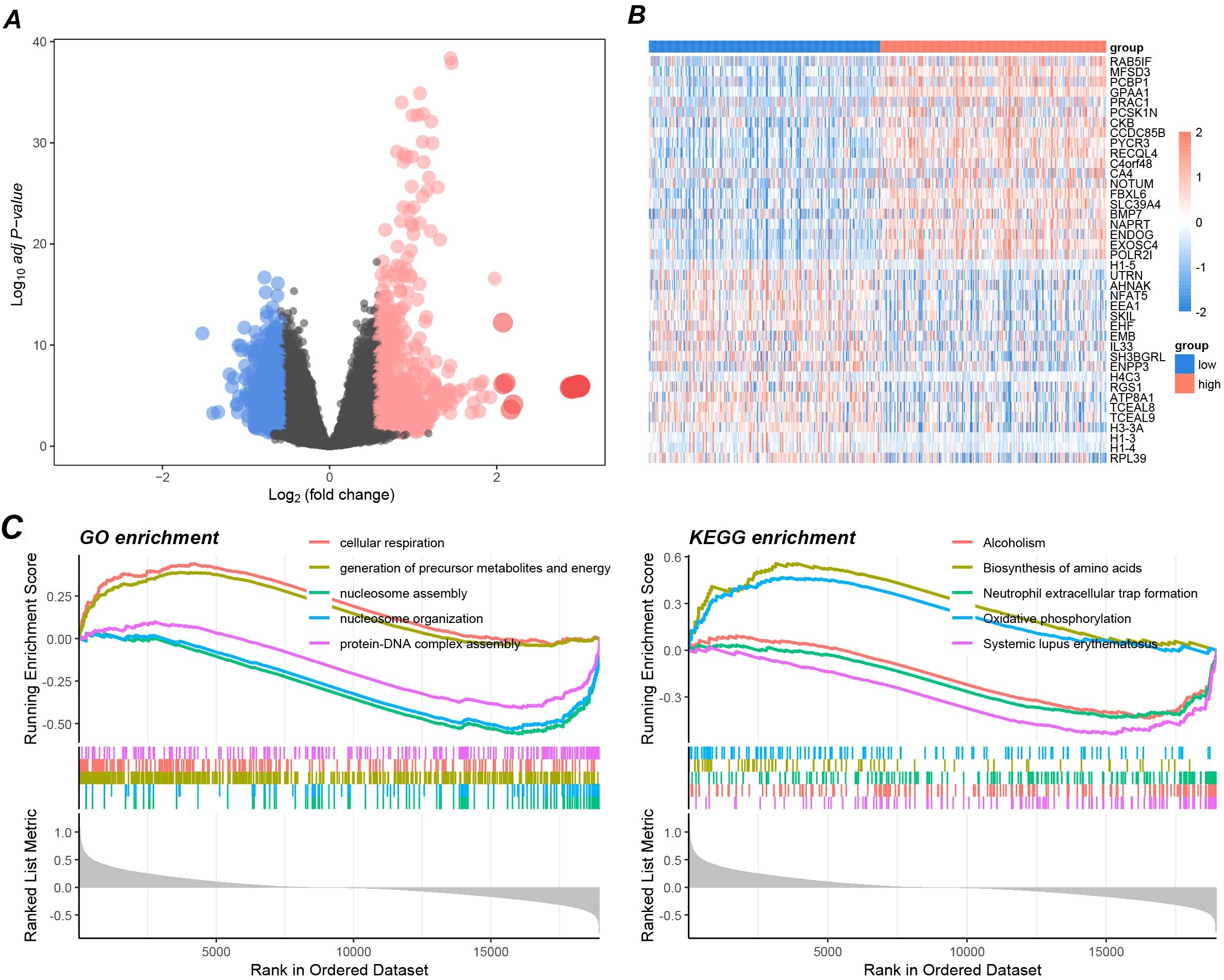 Figure 7. Pathway enrichment analysis of GPAA1 in CRC. (A) Differential gene volcano map between high and low GPAA1 expression groups; (B) Top differential gene display heatmap; (C) GSEA-driven GO and KEGG enrichment analysis.