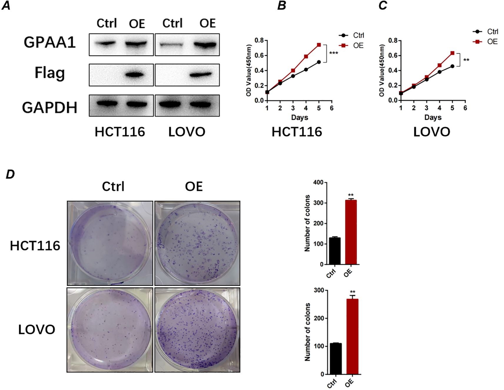 Figure 8. GPAA1 overexpression promotes proliferation and clonogenicity in colorectal cancer cells in vitro. (A) Western blot analysis confirming GPAA1 overexpression in HCT116 and LOVO cells transfected with GPAA1 plasmid (OE) compared to empty vector control (Ctrl). Flag tag indicates exogenous GPAA1 expression; GAPDH serves as loading control.(B, C) Cell proliferation measured by CCK-8 assay in HCT116 (B) and LOVO (C) cells over 6 days. GPAA1 overexpression significantly enhanced proliferation rates (**P<0.01, ***P<0.001). (D) Colony formation assays (left) and quantitative analysis (right) demonstrating that GPAA1 overexpression increased both the number and size of colonies in both cell lines (**P<0.01).