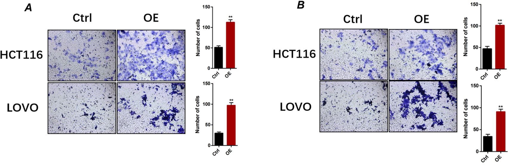 Figure 9. GPAA1 overexpression enhances migratory and invasive capacities of colorectal cancer cells in vitro. (A) Representative images (left) and quantitative analysis (right) of migrated HCT116 and LOVO cells under control (Ctrl) and GPAA1-overexpressing (OE) conditions. (B) Representative images (left) and quantitative analysis (right) of invaded HCT116 and LOVO cells. ** p <0.01.