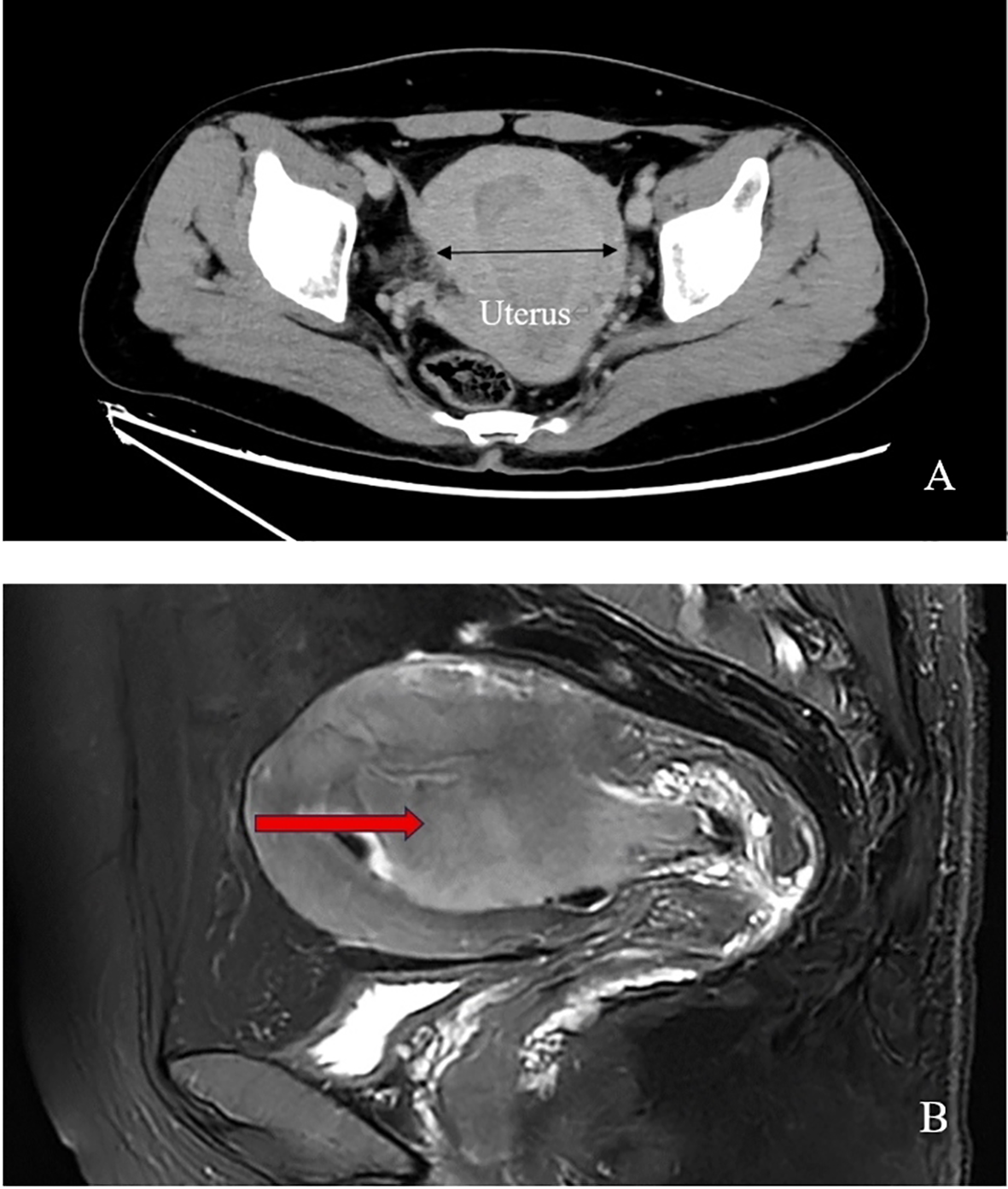 (A) Pelvic enhanced computed tomography scan of the patient shows increased uterine size and a protruding oval-shaped mass in the uterine cavity; (B) Pelvic magnetic resonance imaging reveals an anteverted and bulky uterus with a large oval-shaped mass (arrow point) occupying the entire uterine cavity, resulting in blur endothelium.
