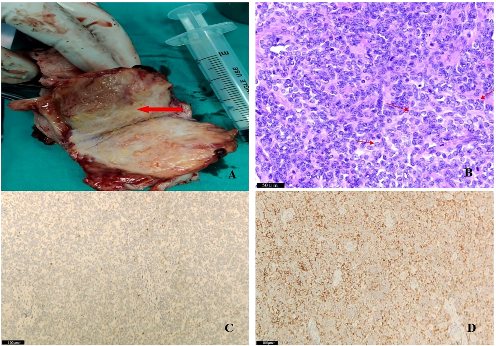 (A) Macroscopic image of the resected uterine specimen during surgery; (B) Final pathology: filled with atypia epitheloid cells (see arrows); areas with low mitotic activity (2-3/10 high power fields) were noted; (C) pancytokeratin positive; (D) desmin positive.