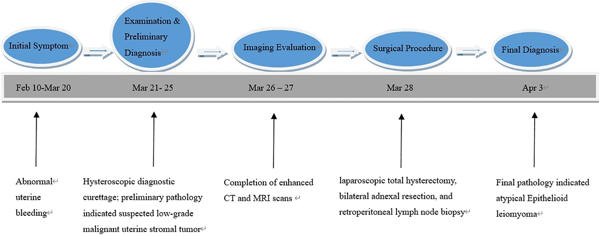 Enhanced computed tomography scan of the lower abdomen showed enlarged uterine volume, marked thickening of the left uterine wall, an oval-shaped mass protruding from the uterine cavity with a maximum cross-sectional dimension of approximately 36 × 71 mm, marked enhancement after contrast administration, normal bladder filling, no obvious enlarged pelvic lymph nodes, and no obvious pelvic effusion (Figure 1A). The examination mentioned above showed an enlarged uterine volume, marked thickening of the left uterine wall, and an elliptical mass protruding from the uterine cavity, suggesting a possible sarcoma. Pelvic magnetic resonance imaging with contrast showed an elliptical abnormal signal focus measuring approximately 42.7 × 71.5 mm in the uterine cavity, appearing as low signal on T1-weighted images and slightly higher signal on T2-weighted images, with restricted diffusion. The lesion had unclear boundaries with the left posterior uterine wall muscle layer and showed significant enhancement after contrast administration (Figure 1B). A scar shadow was seen on the anterior wall of the lower uterine segment; multiple Nabothian cysts were observed in the cervix; there was a small amount of blood in the uterine cavity; and no obvious enlarged lymph node or fluid accumulation was seen in the pelvis. No obvious abnormal enhancement foci were observed after contrast administration. Based on these findings, the possibility of a uterine endometrial stromal sarcoma was suspected. Concurrent pathological assessment showed small, round to short, spindle-shaped tumor cells with infiltrative growth in the endometrial layer and myometrium of the uterus. The cells were of uniform size and had a mild pleomorphism, with mitotic figures <5 per 10 high-power fields (HPF). Based on the immunohistochemical findings, the diagnosis was suspected to be a mesenchymal tumor of intermediate or low malignancy grade. Therefore, close follow-up was recommended. Immunohistochemistry results showed positive pan-cytokeratin and desmin. CD34, H-caldesmon, HMB45, MyoD1, myogenin, SF-1, and SALL4 were negative. Ki67 was 5%. Based on the pathological assessment, it was difficult to definitively categorize the tumor as benign or malignant; however, potential for malignant transformation was suggested. Considering the patient’s age, marital status, reproductive history, and risk of malignancy, and excluding contraindications for surgery, laparoscopic total hysterectomy, bilateral adnexal resection, and retroperitoneal lymph node biopsy were performed. During the procedure, the uterus was enlarged to the size of a 3-month gravid uterus; bilateral ovaries and fallopian tubes appeared normal. However, there were partial adhesions between the bilateral fallopian tubes, ovaries, uterine wall, and intestinal tract. During the procedure, the uterus was incised, and a protruding, hard mass measuring approximately 6×4 cm was observed within the uterine cavity (Figure 2A). The surgery was performed smoothly, and approximately 300 mL of blood was lost during the procedure. The patient recovered well after surgery. Postoperative pathological assessment of the resected uterus and bilateral adnexa showed small, round to short, spindle-shaped tumor cells intermingled with the smooth muscle of the uterine wall. The cells were uniform in size and had mild pleomorphism, with mitotic figures 2-3 per 10 HPF (Figure 2B). Immunohistochemistry indicated the following findings: the tumor cells were positive for pancytokeratin (Figure 2C), vimentin, desmin(Figure 2D), and calretinin and weakly positive for WT-1, D2-40, CK5/6, and ALK. HMB45, h-caldesmon, MyoD1, myogenin, INSM-1, CD56, CD34, ERG, cyclin D1, SF-1, and SALL4 were negative; Ki67 was 5%. Based on the previous curettage biopsy and postoperative immunohistochemical results, the patient was diagnosed with epithelioid STUMP. The tumor exhibited infiltrative growth at its periphery, indicating malignant potential. Therefore, a close follow-up was recommended. The resected specimen also showed endometrial hyperplasia, chronic cervicitis, Nabothian cysts, multiple follicular cysts in both ovaries, and paramesonephric duct cysts. However, as the final pathology did not indicate a malignant tumor, no adjuvant therapy, such as radiotherapy or chemotherapy, was administered. The patient was discharged smoothly on the 7th day post-surgery. The last follow - up after surgery showed that the patient had not recurred for 8 months. Timeline of the patient’s disease and treatment course was shown in Figure 3. CARE Checklist of information was summarized in the Supplementary Data Sheet 1.