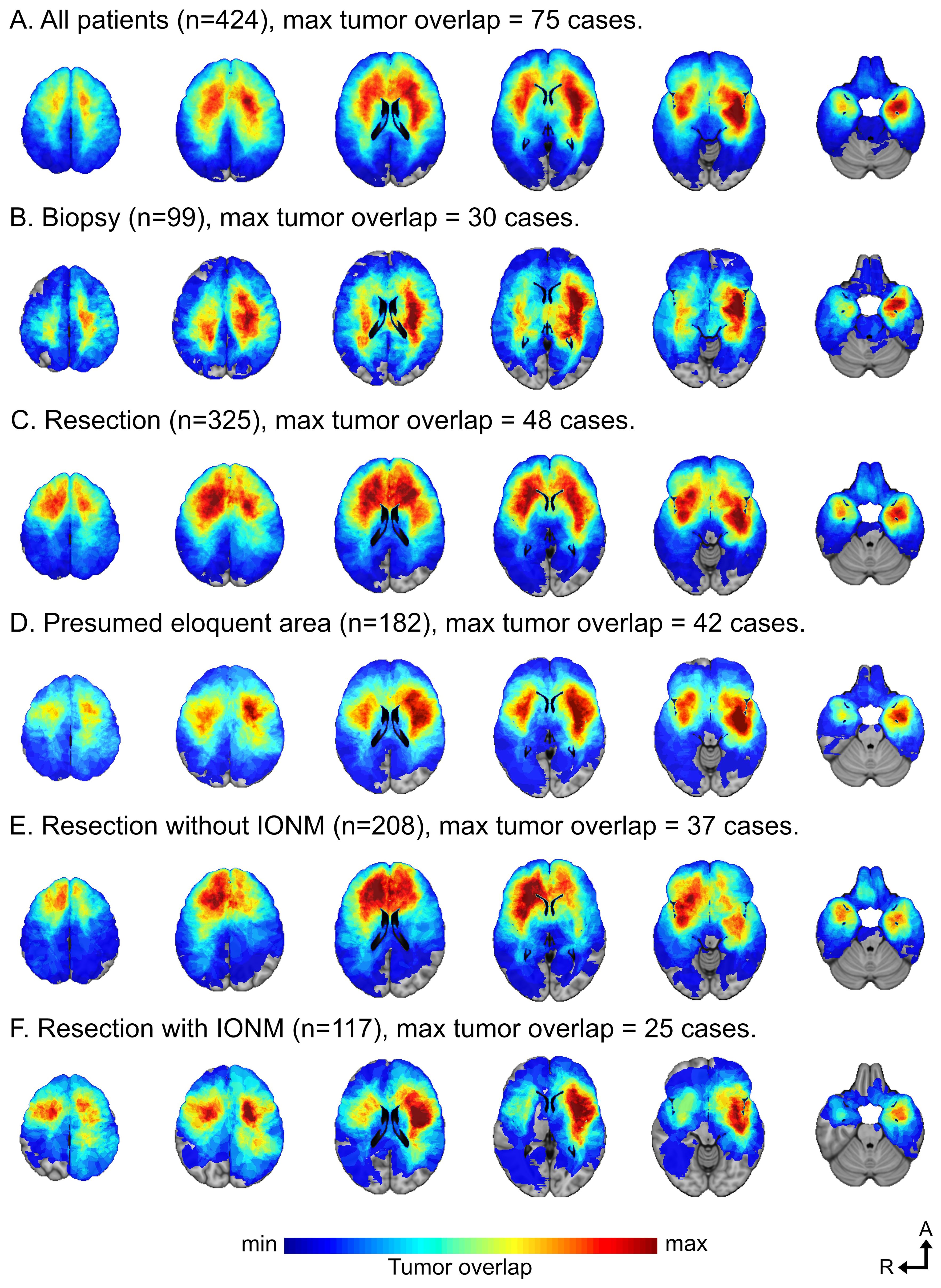 Figure 1. (A-F) A location heatmap showing spatial distribution for all tumors (A). Separate heatmaps for the tumor locations in patients selected for biopsy (B), resection (C), presumed eloquent area (D), resection without IONM (E), and resection with IONM (F). Figures based on available tumor segmentations on Montreal Neurological Institute (MNI) space (axial slices 50, 35, 20, 5, -10 and -25 mm). The scale of tumor overlap was adjusted to the maximum overlap for each group (A-F).