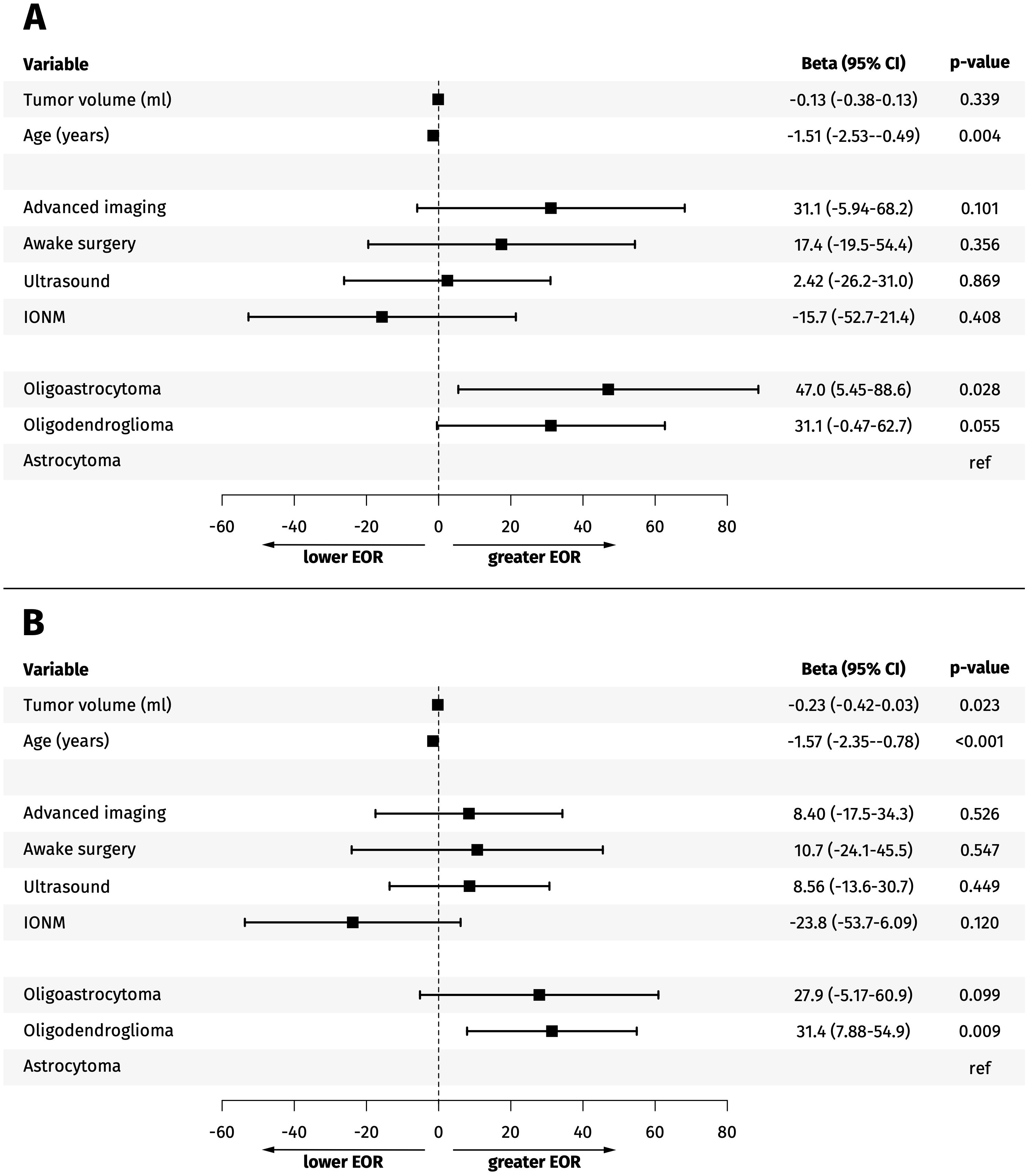 Two forest plots labeled A and B compare variables affecting the extent of resection (EOR) in tumor surgeries. Plot A shows factors like tumor volume, age, advanced imaging, and awake surgery, with variables such as oligoastrocytoma showing significant positive influence on EOR. Plot B similarly assesses these variables, with oligodendroglioma significantly affecting EOR. Beta values, confidence intervals, and p-values are included.