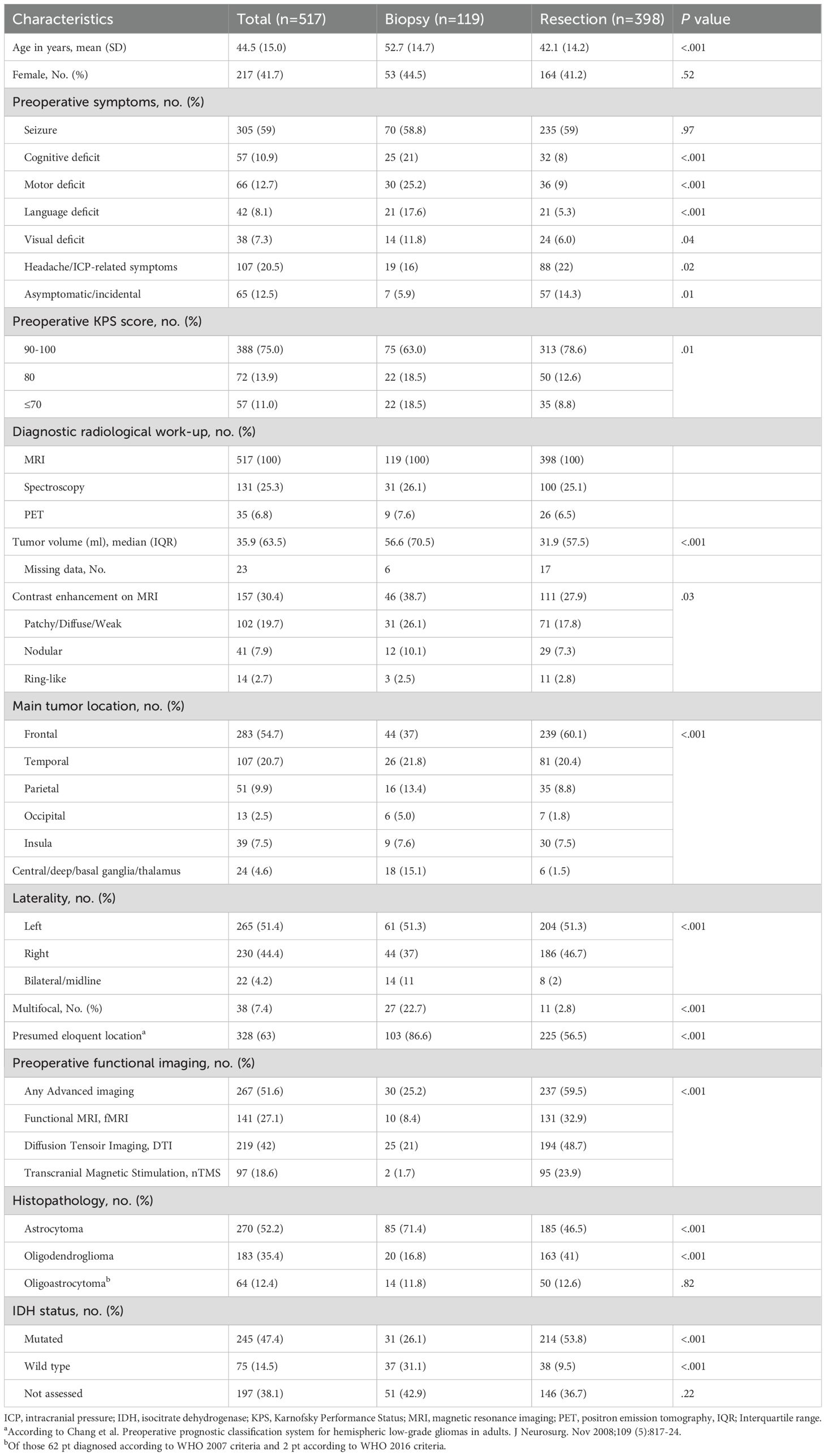 Maximal safe resection remains a key therapeutic approach for diffuse low-grade gliomas (dLGG) and provides significant survival benefits (15). Upfront surgery is recommended for diagnostic and therapeutic purposes. Biopsy only is an adverse prognostic factor for overall survival (68). Investigating surgery selection at a population level can help us understand the context of the surgical literature.