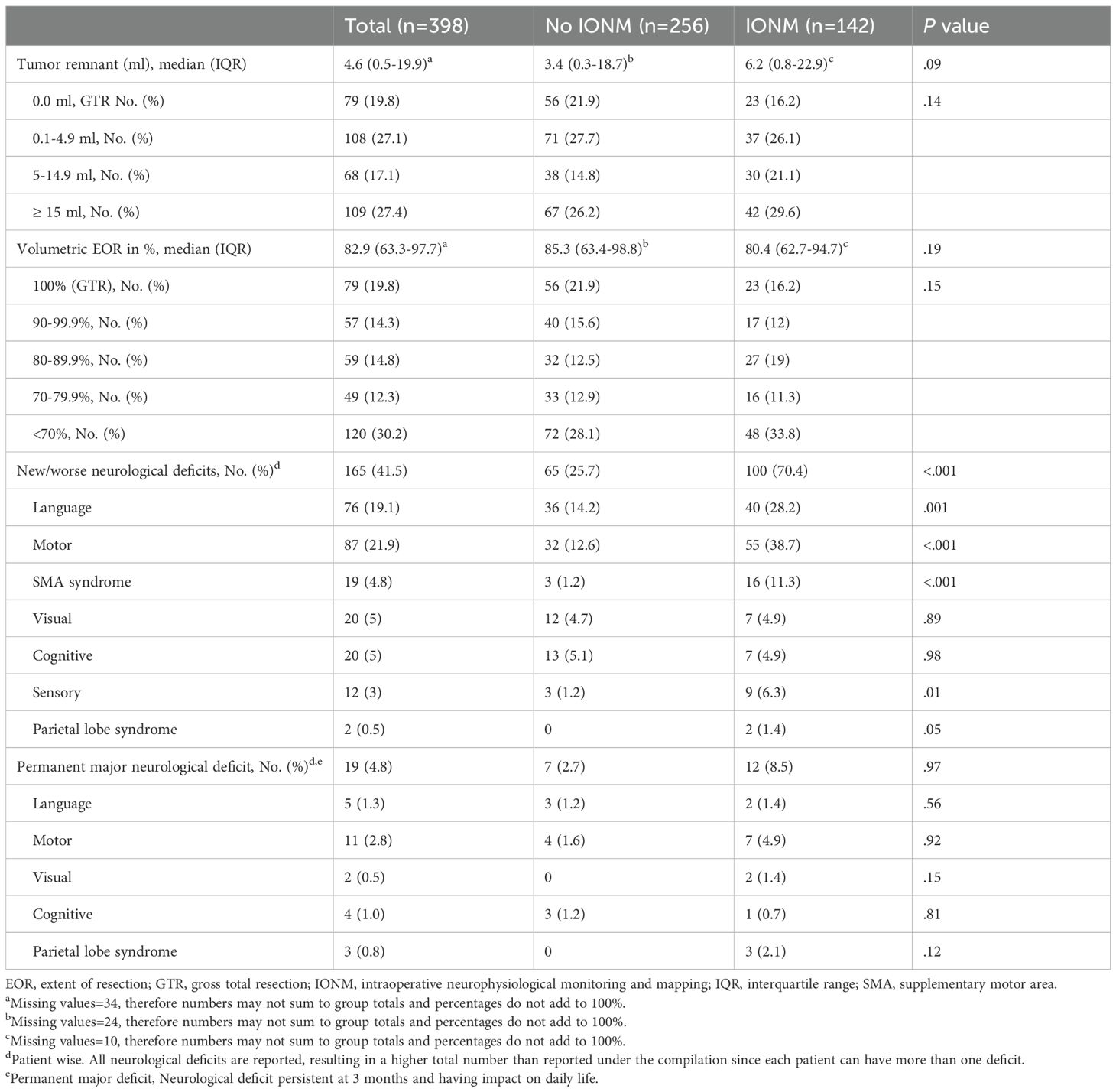 We observed a significantly higher incidence of new deficits in patients who underwent resection with IONM, in concordance with the literature reporting a common occurrence of neurological worsening in presumed eloquent tumors (15, 46). Fortunately, there was no significant difference between the subgroups in terms of permanent major deficits. Additionally, no correlation between increased extent of resection (EOR) and a higher frequency of deficits or adverse events was observed. Nor did we find significant variation across centers.