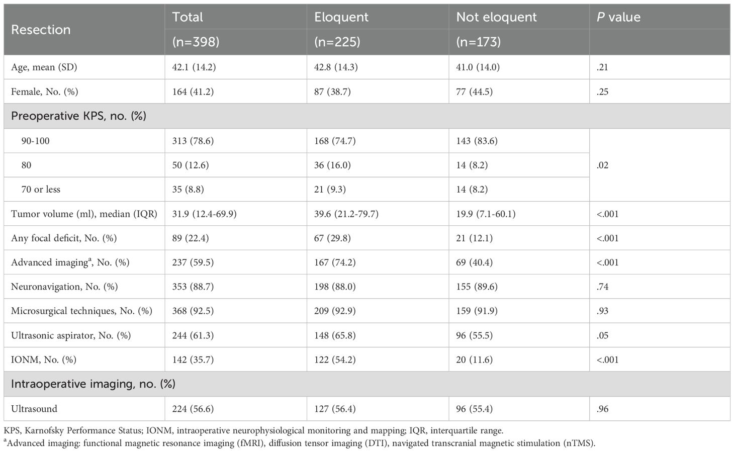 Table 3. Preoperative work up, surgical techniques, and perioperative treatment for tumors in a presumed eloquent area vs not eloquent area.
