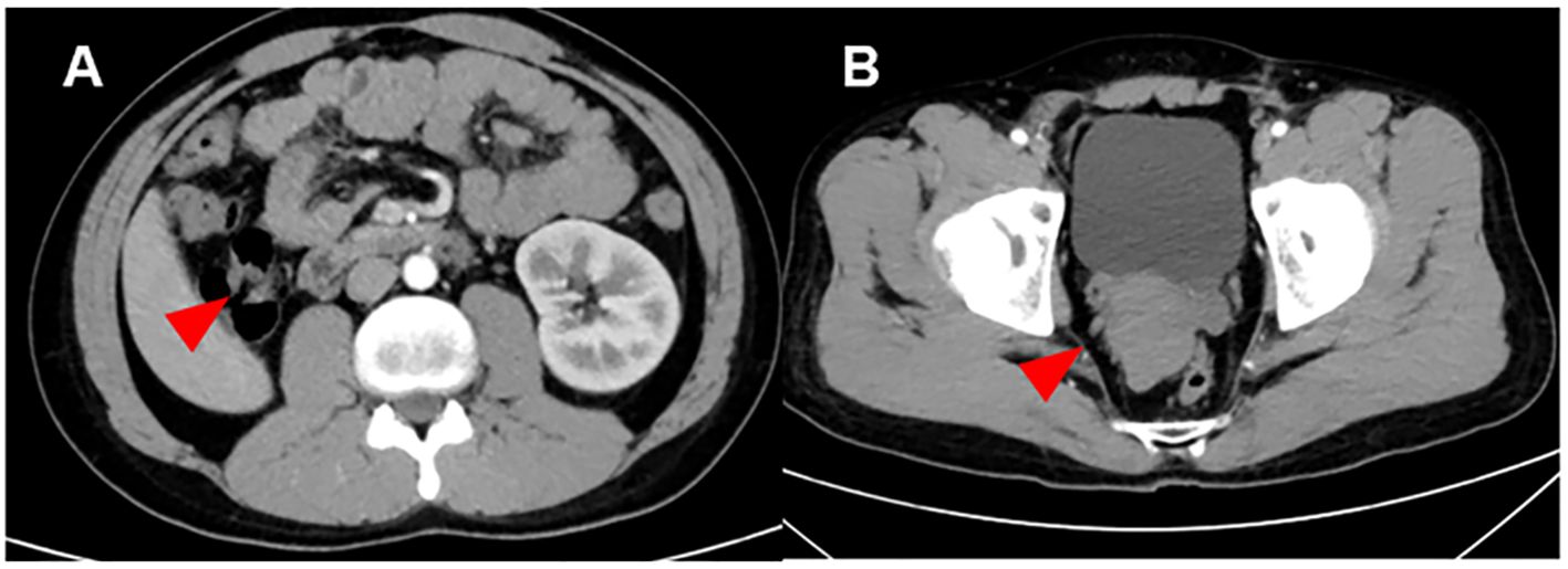 Figure 1. Computed tomography image of the Zinner syndrome. (A) Imaging examination showed that the patient has absence of the right kidney: The right kidney and right ureter are not visualized (red arrow). A strip-like soft tissue shadow is seen in the original course area of the right ureter, extending downward to the right seminal vesicle area. (B) Imaging examination showed that the patient has seminal vesicle cysts: An irregular mass-like soft tissue shadow is seen in the right seminal vesicle area (red arrow), measuring approximately 6.4 × 4.6 cm, with no definite enhancement. It is closely adjacent to the posterior wall of the bladder, the prostate, and the left seminal vesicle. The right seminal vesicle with its normal morphology is not visualized.
