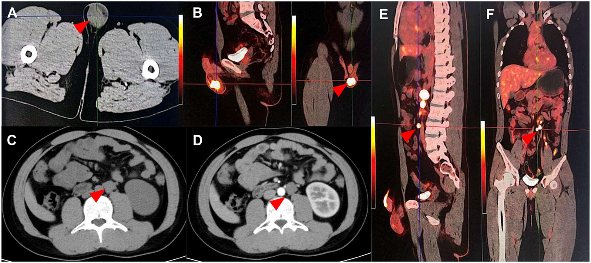 Figure 2. Computed tomography and Positron Emission Tomography and Computed Tomography image of the testicular cancer. (A, B) Primary lesion of the testicular cancer: The left testis is enlarged with a soft tissue density nodule, measuring approximately 2.92 cm × 2.81 cm (red arrow). The 18F-FDG radioactive uptake is significantly enhanced, with a maximum standardized uptake value (SUV max) of 13.80. (C–F) Retroperitoneal lymph node metastatic lesion of the testicular cancer: Multiple enlarged lymph nodes of varying sizes are detected adjacent to the abdominal aorta and left iliac vessels, with varying degrees of increased radioactive uptake. The SUV max ranges from 7.04 to 31.71, and the larger one measures approximately 28.9 mm × 21.4 mm.