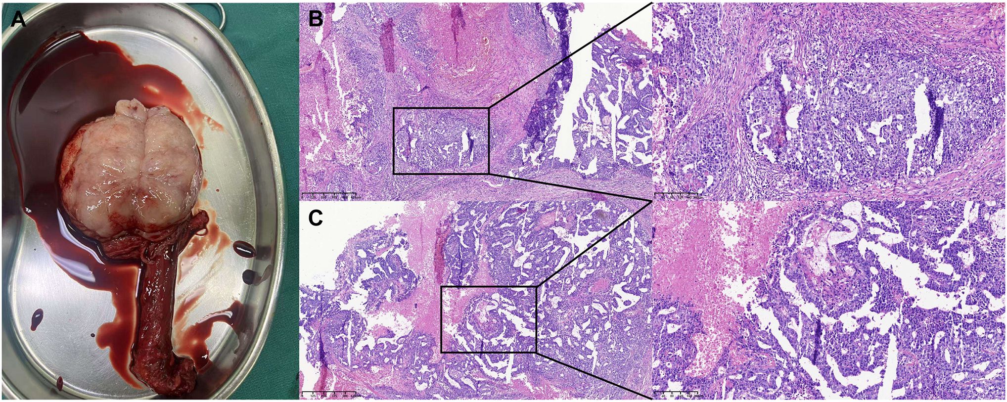 Figure 3. Surgical resection specimen and pathological staining of the testicular cancer. (A) Surgical resection specimen of the testicular cancer. (B, C) Postoperative pathology examination suggested testicular embryonal carcinoma: No cancer was detected at the spermatic cord stump.