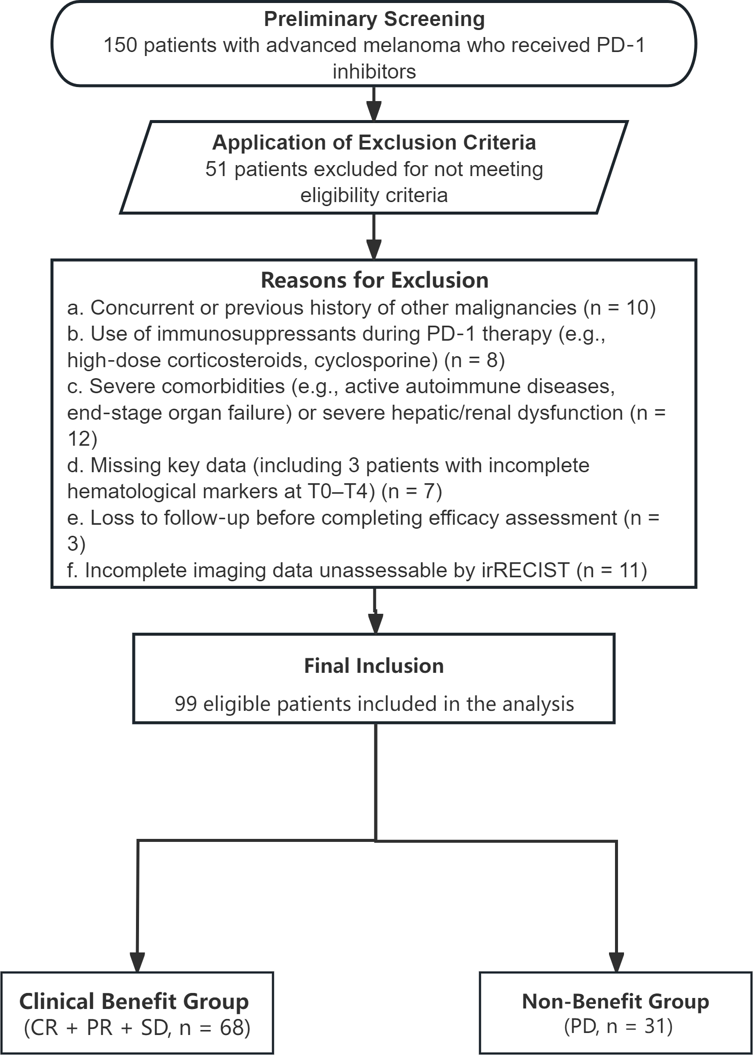 b. Treatment Protocols: All patients received PD-1 inhibitor-based regimens (≥4 consecutive cycles) in strict adherence to the 2022 Chinese Society of Clinical Oncology (CSCO) Guidelines for Malignant Melanoma, tailored to tumor subtype, tumor burden, and clinical characteristics. Patients were stratified into three core groups:
