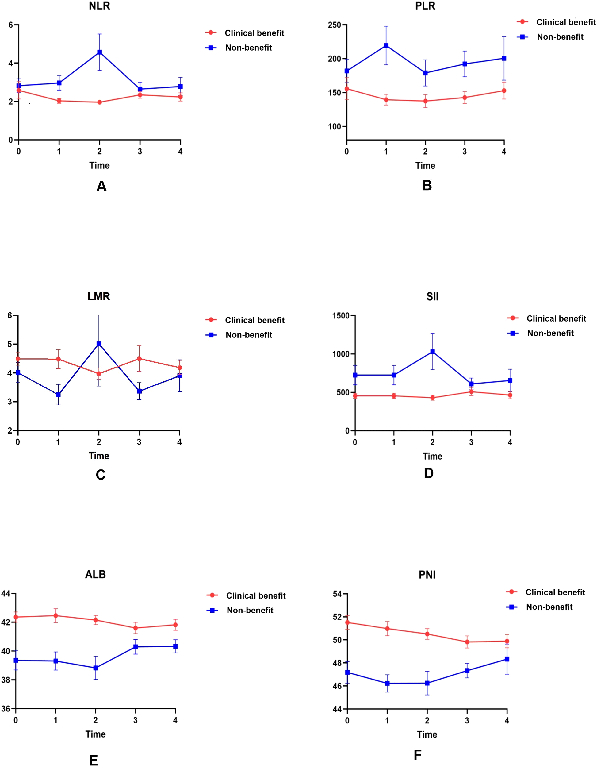 A retrospective analysis was conducted on 99 patients with advanced malignant melanoma who received PD-1 monoclonal antibody treatment at the First Affiliated Hospital of Zhengzhou University (January 2019–September 2024). Imaging evaluations (CT/MRI, with PET-CT for suspected distant metastasis) were performed at baseline (T0, before treatment), the end of the 2nd cycle (T2), and the end of the 4th cycle (T4) to assess treatment response per the immune-related Response Evaluation Criteria in Solid Tumors (irRECIST).After four treatment cycles, patients were stratified into a clinical benefit group (complete response [CR] + partial response [PR] + stable disease [SD], n=68) and a non-benefit group (progressive disease [PD], n=31) based on the immune-related Response Evaluation Criteria in Solid Tumors (irRECIST). Peripheral blood samples were collected at five time points: baseline (T0), post-first cycle (T1), post-second cycle (T2), post-third cycle (T3), and post-fourth cycle (T4). Dynamic changes in neutrophil-to-lymphocyte ratio (NLR), platelet-to-lymphocyte ratio (PLR), lymphocyte-to-monocyte ratio (LMR), systemic immune-inflammation index (SII), serum albumin (ALB), and prognostic nutritional index (PNI) were compared between groups. Line graphs and box plots were used to visualize indicator trends, while logistic regression and receiver operating characteristic (ROC) curves were applied to evaluate prognostic value.