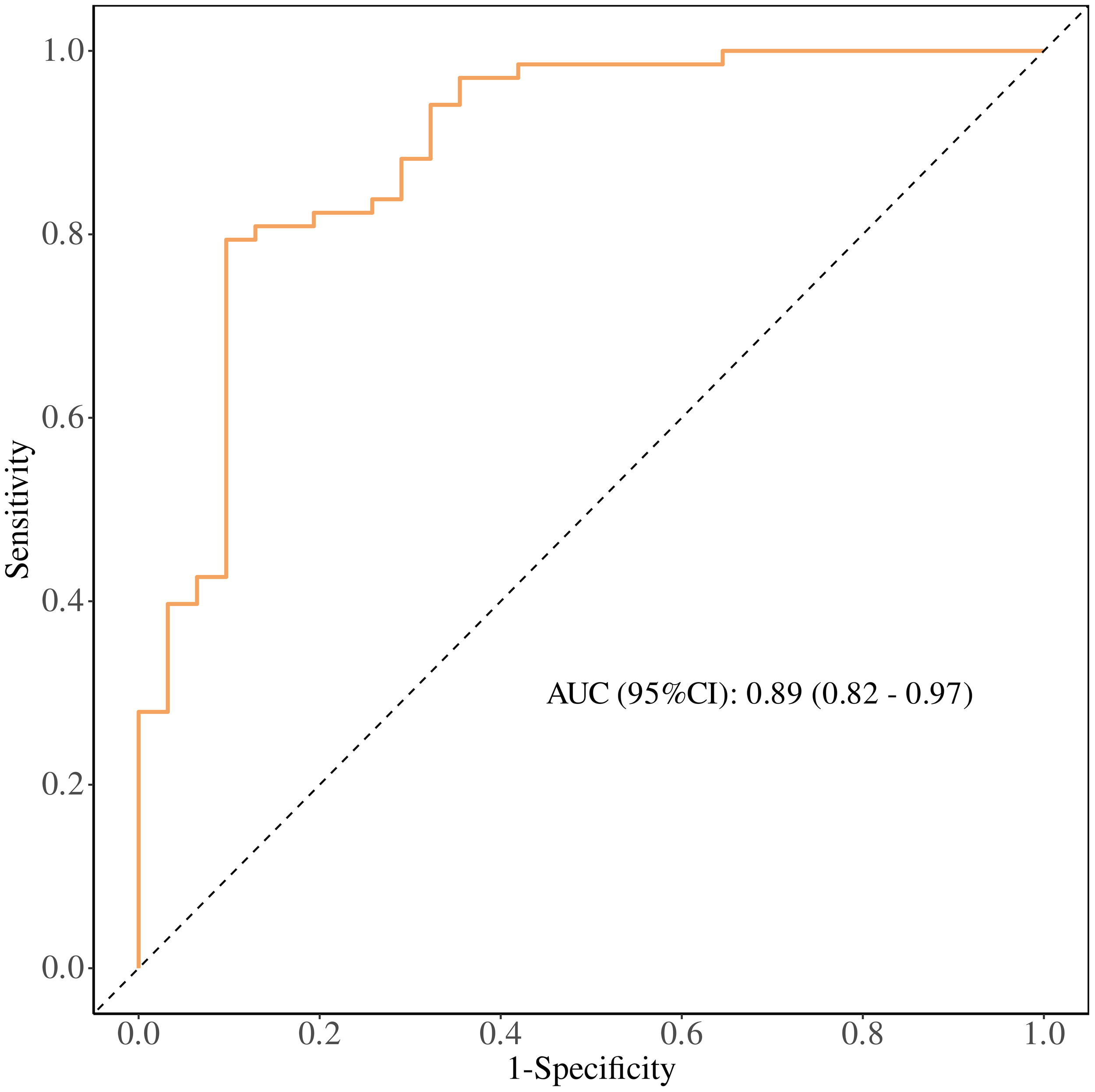 It is important to note that the model used in this study has not been validated internally or externally. The reported AUC is preliminary and should be considered exploratory, as no calibration curves were included in the analysis.