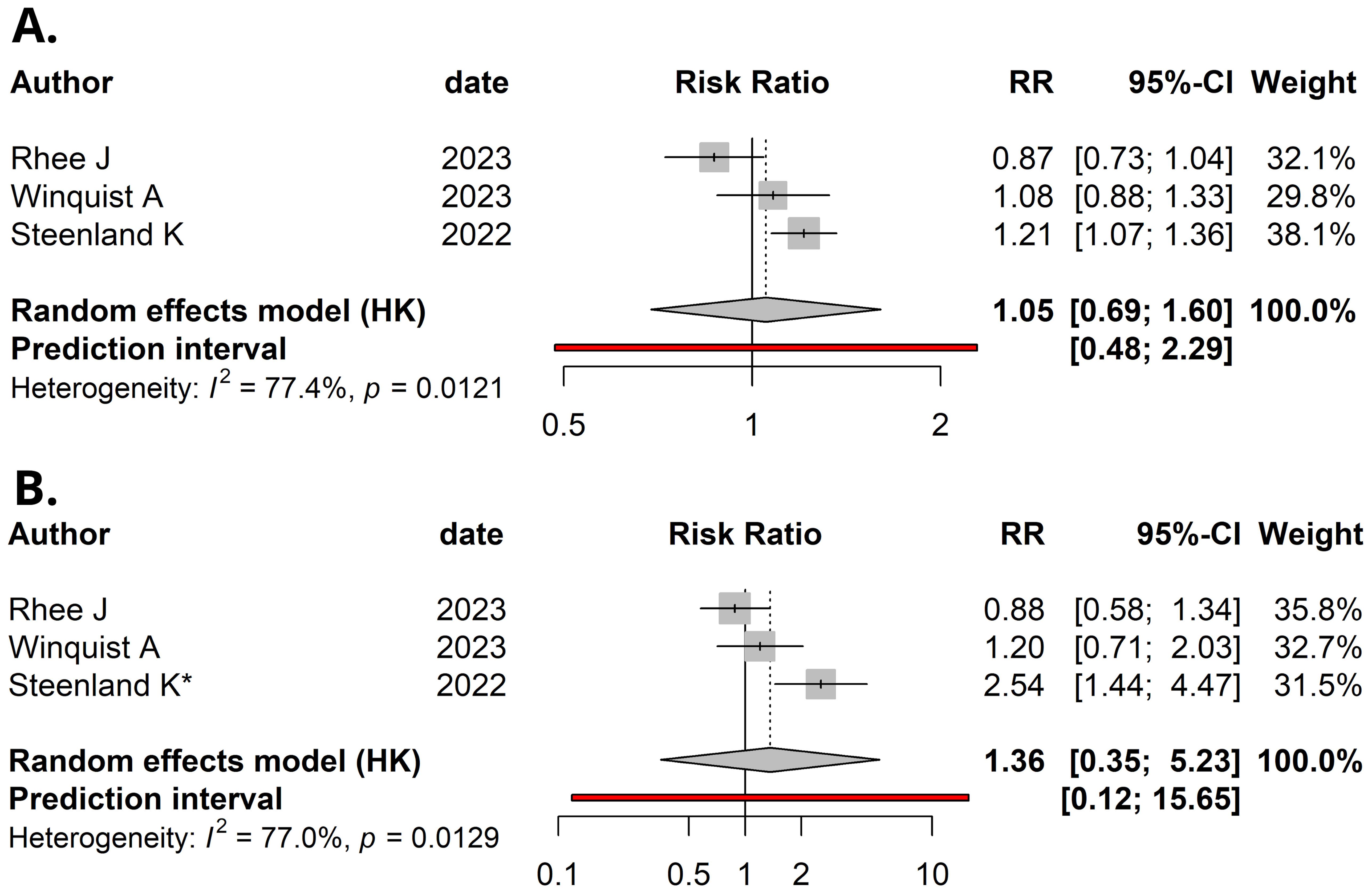 Figure 2. Forest plot (random-effects model) of studies’ relative risks, 95% confidence intervals (CI), and meta-analyses for: (A) Per natural log-unit increase in serum/plasma PFOA concentrations (ng/mL) and renal cancer risk. (B) Upper versus lower quartile in serum/plasma PFOA concentrations and renal cancer risk. *, Upper quintile data was used, as quartiles were not available in Steenland et al. I², Higgins & Thompson’s statistic.