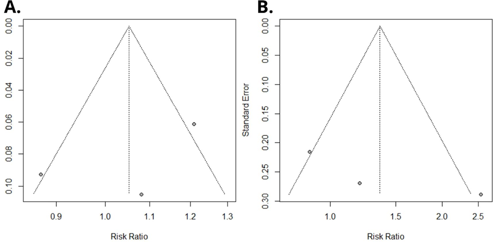Figure 3. Funnel plot of Egger’s test on the associations between PFOA exposure and risk of renal cancer among studies included in the meta-analysis. (A) Overall serum/plasma PFOA concentrations (ng/mL) and renal cancer risk. (B) Upper versus lower quartile in serum/plasma PFOA concentrations and renal cancer risk.