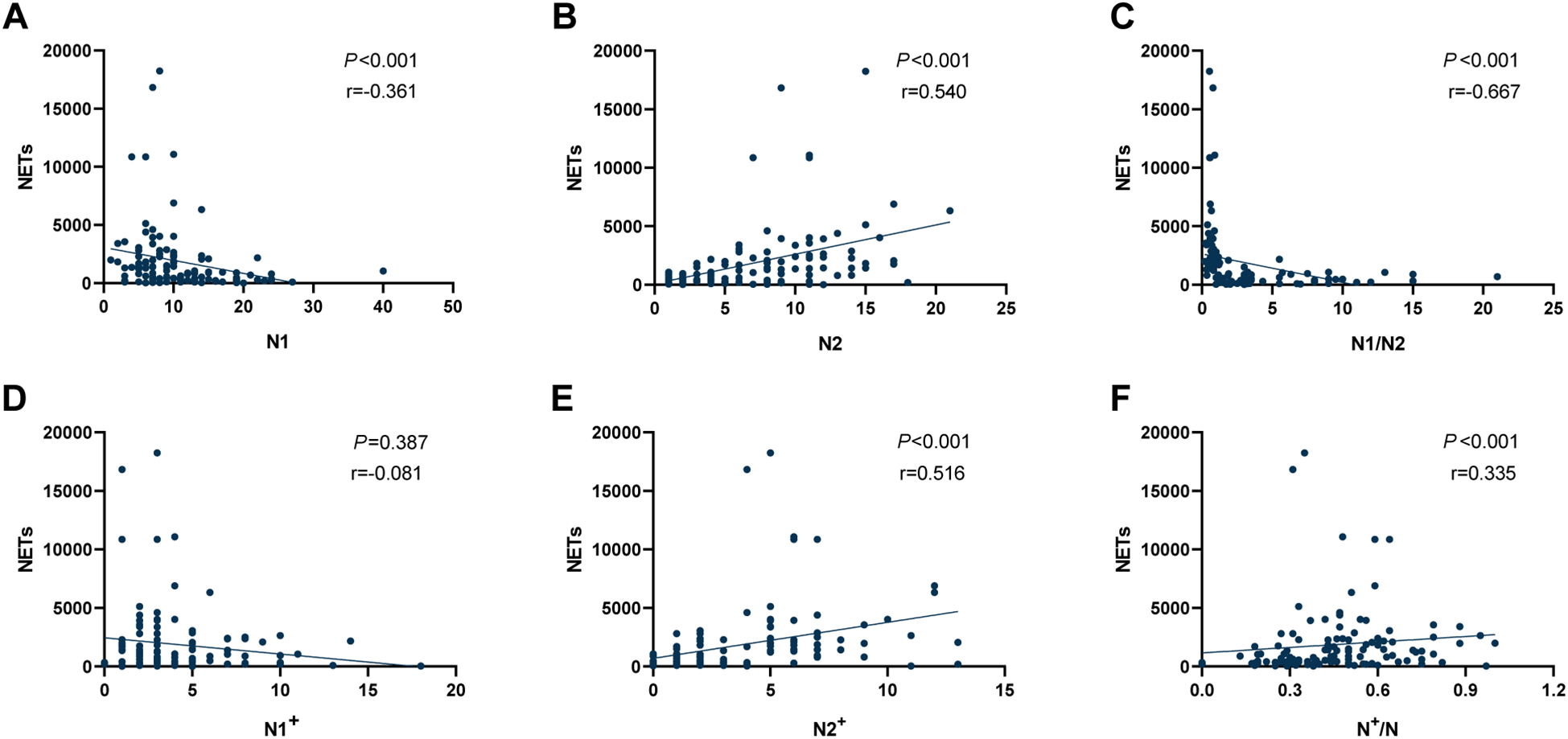 In addition, we conducted a correlation analysis between NETs levels and the polarization status of TANs, as shown in Figure 2. NETs expression exhibited a negative correlation with tumour-associated N1 neutrophil counts (r=-0.361, P < 0.001; Figure 2A), although this association was not robust. However, NETs expression showed a significant positive correlation with tumour-associated N2 neutrophil counts (r = 0.540, P < 0.001; Figure 2B), and a higher N1/N2 ratio correlated with lower NETs expression (r=-0.667, P < 0.001; Figure 2C). NETs levels showed no statistically significant relationship with tumour-associated N1+ neutrophils (r=-0.081, P = 0.387; Figure 2D), but exhibited a significant positive correlation with tumour-associated N2+ neutrophils (r=0.516, P < 0.001; Figure 2E). A positive correlation trend was also observed with N+/N (r=0.335, P < 0.001; Figure 2F).