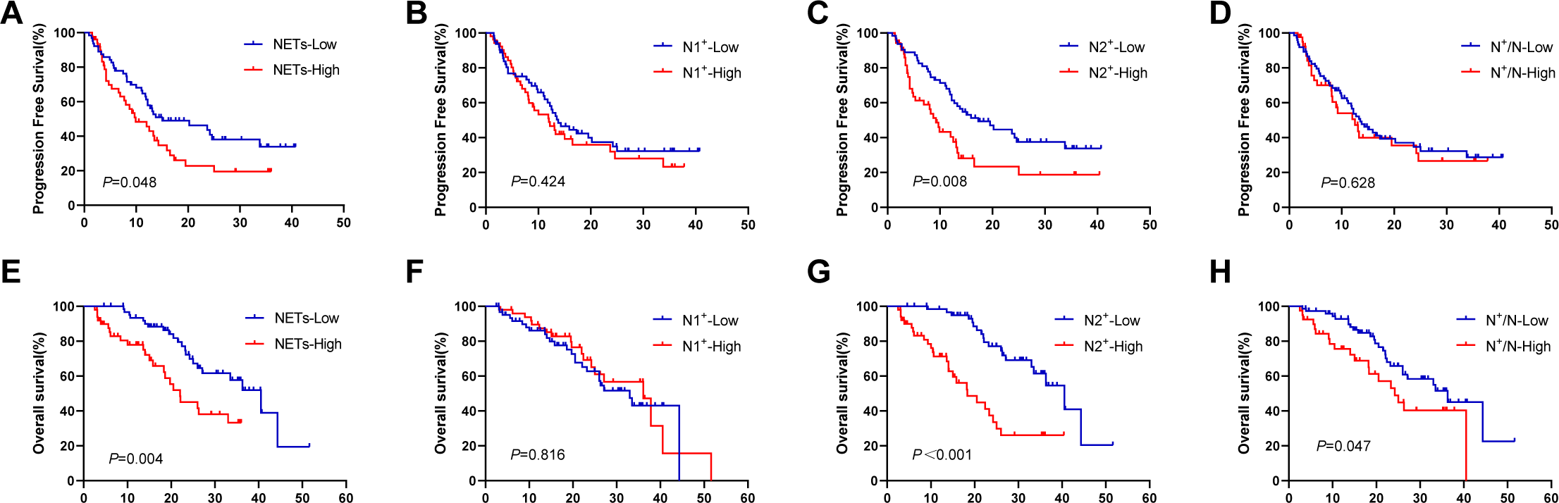In this research, statistical analyses were conducted using SPSS 24.0. Continuous variables were compared using appropriate parametric (t test) or nonparametric (Mann-Whitney U) tests on the basis of data distribution. Connections between NETs, TANs, clinicopathological features, and immune cell presence were assessed using the Pearson chi-square test or Fisher’s exact test. To analyse associations between two continuous variables, we used Spearman’s method or the Mann-Whitney U test. Differences in PFS and OS among the participants were assessed via the log-rank test with Kaplan-Meier curves. Univariate and multivariate Cox proportional hazards models were used to identify independent prognostic factors. A threshold for statistical significance was set at a two-tailed P value under 0.05.