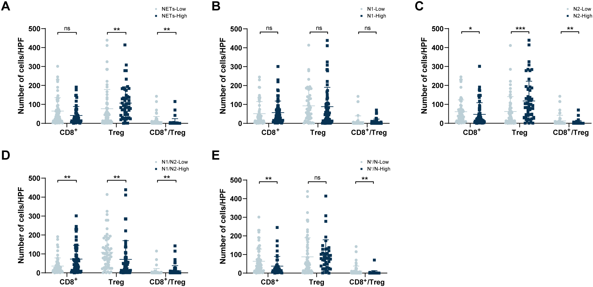 We evaluated the relationships among TANs and clinicopathological factors, as detailed in Table 2. Our analysis revealed no significant differences between the N-low and N-high groups, N1-low and N1-high groups or between the N1/N2-low and N1/N2-high groups when variables such as age, sex, smoking habits, ECOG PS, pathological type, tumour stage, lymph node involvement, TNM classification, number of metastatic sites, and treatment options were considered, confirming the comparability between the two groups. However, a significantly greater proportion of smokers was observed in the N2-low subgroup than in the N2-high subgroup (70.0% vs 50.9%, P = 0.048), with no other substantial differences noted. The number of patients in the CD8+ T-low and CD8+ T-high groups, as well as those in the Treg-low and Treg-high groups, showed no significant difference between the N-low and N-high groups in the TIME (P = 0.105; P = 0.338). Furthermore, there were no significant differences between the N1-low and N1-high groups concerning patients in the CD8+ T-low and CD8+ T-high groups, as well as those in the Treg-low and Treg-high groups in the TIME (P = 0.324; P = 0.432). However, in the N2-low group, we observed a higher proportion of patients exhibiting elevated CD8+ T-cell infiltration (P = 0.030), whereas in the N2-high group, more patients demonstrated reduced CD8+ T-cell infiltration (P < 0.001).