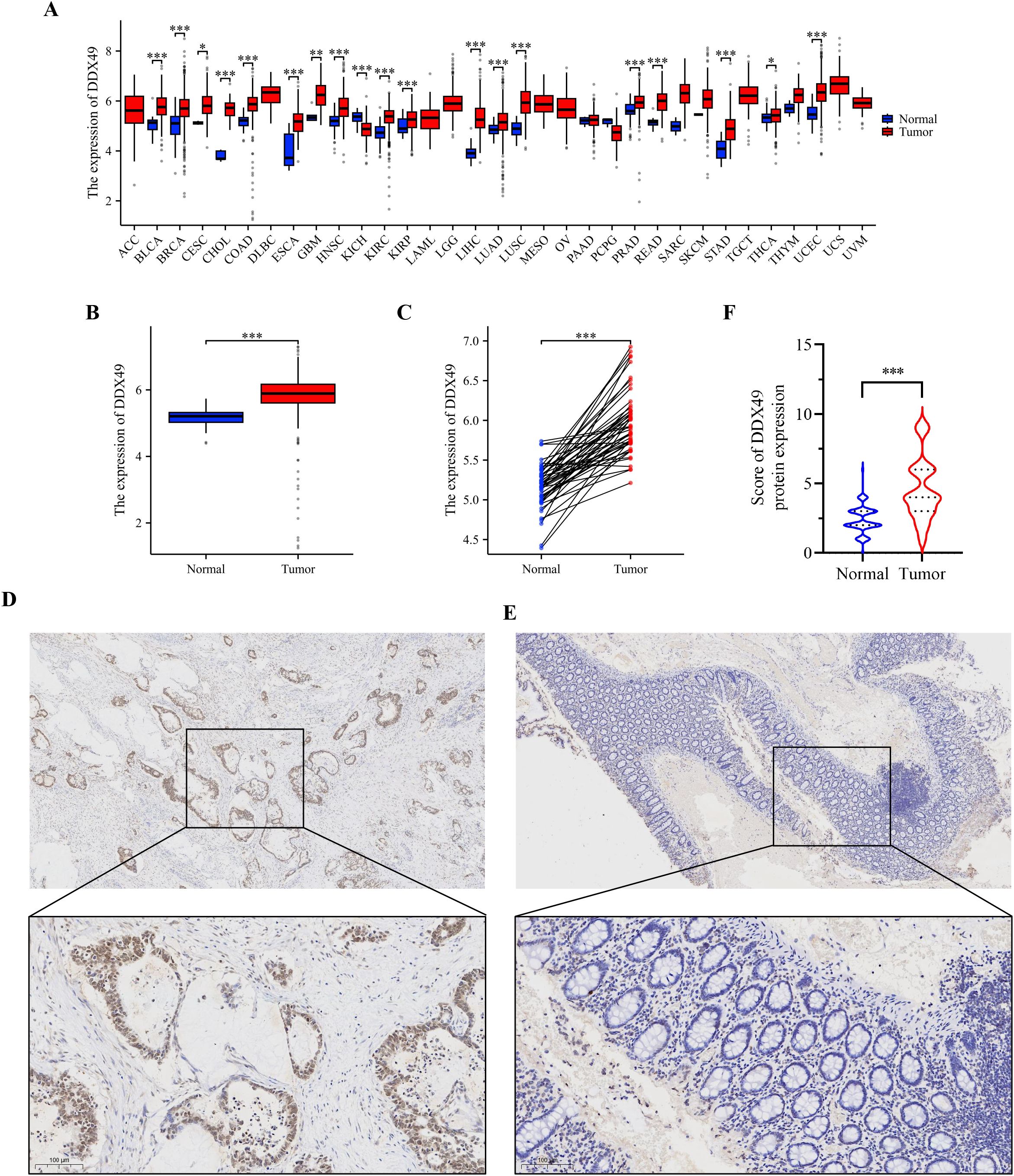 Figure 1. Pan-cancer analysis and IHC results consistently demonstrate that DDX49 was highly expressed in CRC. (A) Pan-cancer analysis results of DDX49 (unpaired). (B, C) DDX49 expression in CRC (B: unpaired, C: unpaired). (D) IHC results of DDX49 in CRC tumor tissues. (E) IHC results of DDX49 in CRC paracancerous tissues. (F) Comparison of IHC result evaluation scores. *P ≤ 0.05, **P ≤ 0.01, ***P ≤ 0.001, ns, not significant.