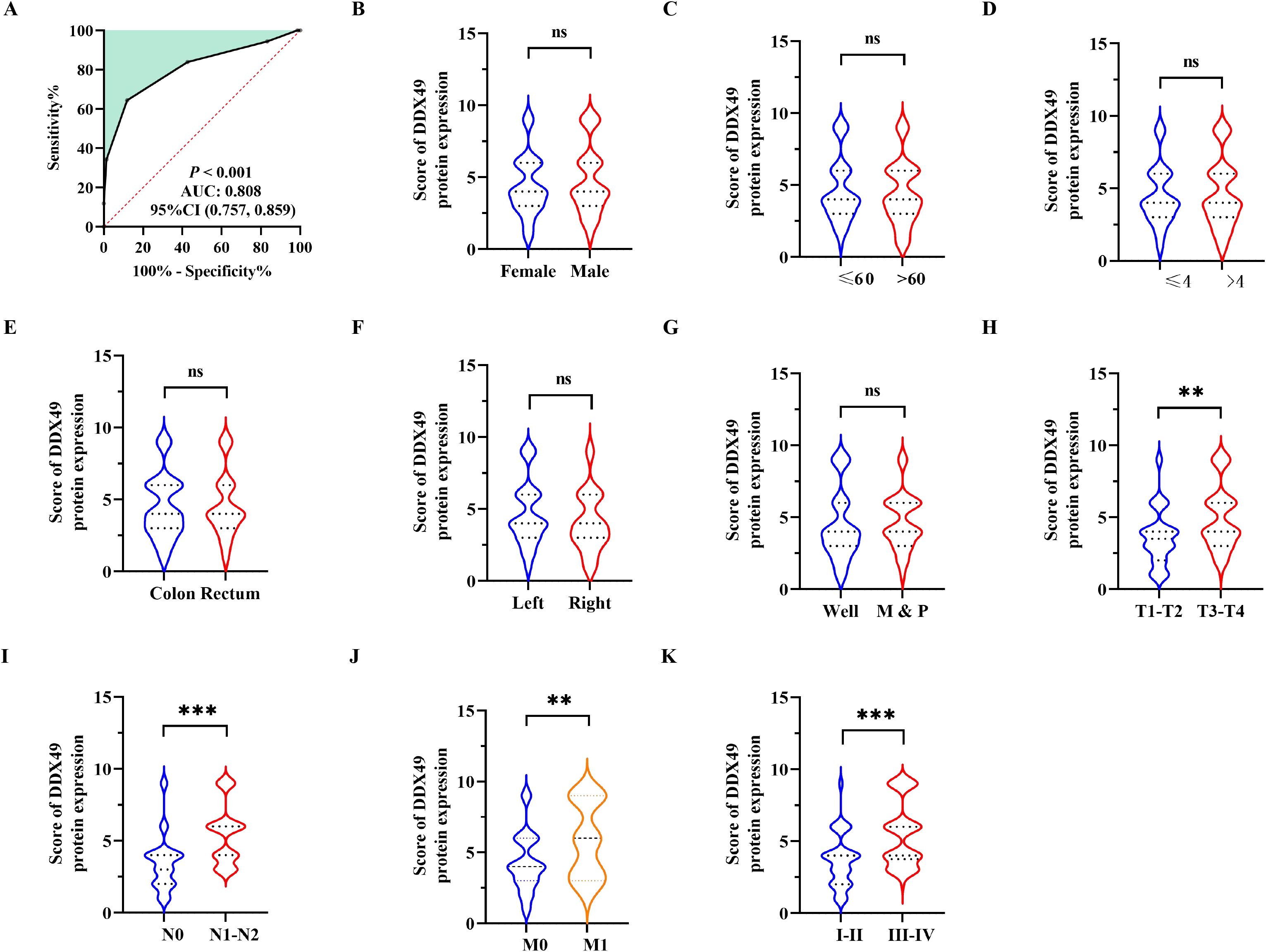 Figure 2. Correlation between DDX49 expression and clinicopathological features in CRC. (A) The optimal cutoff value of DDX49 was determined using the Youden index from the ROC curve. (B) DDX49 expression in male versus female CRC patients. (C) DDX49 expression across different age groups. (D) DDX49 expression in relation to tumor size. (E) DDX49 expression in relation to tumor location. (F) DDX49 expression in relation to cancer site. (G) DDX49 expression in relation to histological differentiation (M: moderate differentiation; P: poor differentiation). (H) DDX49 expression in relation to depth of tumor invasion (T stage). (I) DDX49 expression in relation to lymph node metastasis (N stage). (J) DDX49 expression in relation to distant metastasis (M stage). (K) DDX49 expression in relation to TNM stage. *P ≤ 0.05, **P ≤ 0.01, ***P ≤ 0.001, ns, not significant.