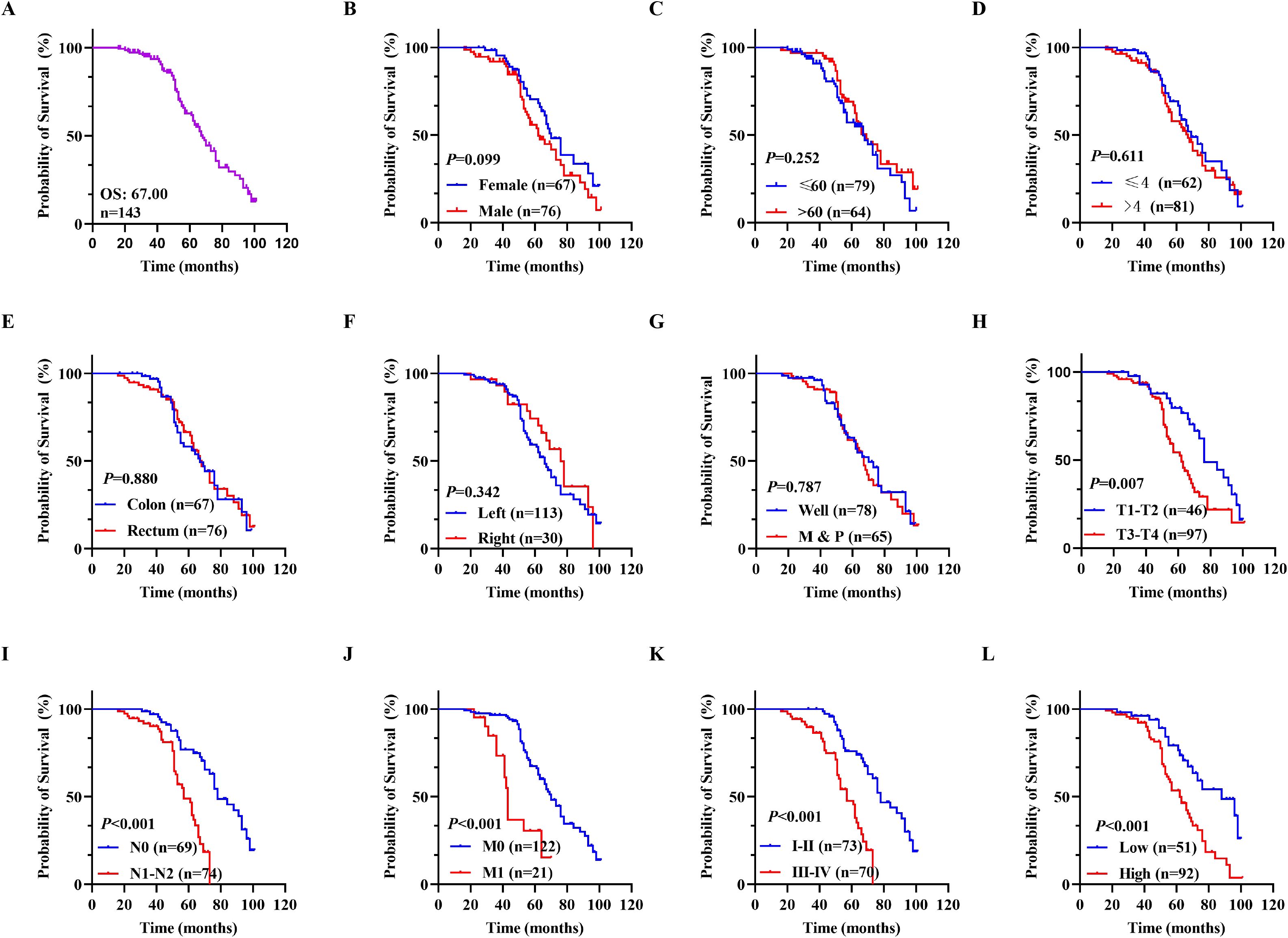 Figure 3. Kaplan-Meier survival curves for OS in CRC patients. (A) Overall survival rates in all 143 CRC patients. (B-G) Prognostic values of gender, age, tumor size, tumor location, cancer site, and differentiation for OS in patients with CRC, respectively. (H-K) Overall survival differences among CRC patients stratified by T stage, N stage, M stage, and TNM stage in sequence. (L) Overall survival curves stratified by DDX49 expression. *P ≤ 0.05, **P ≤ 0.01, ***P ≤ 0.001, ns, not significant.