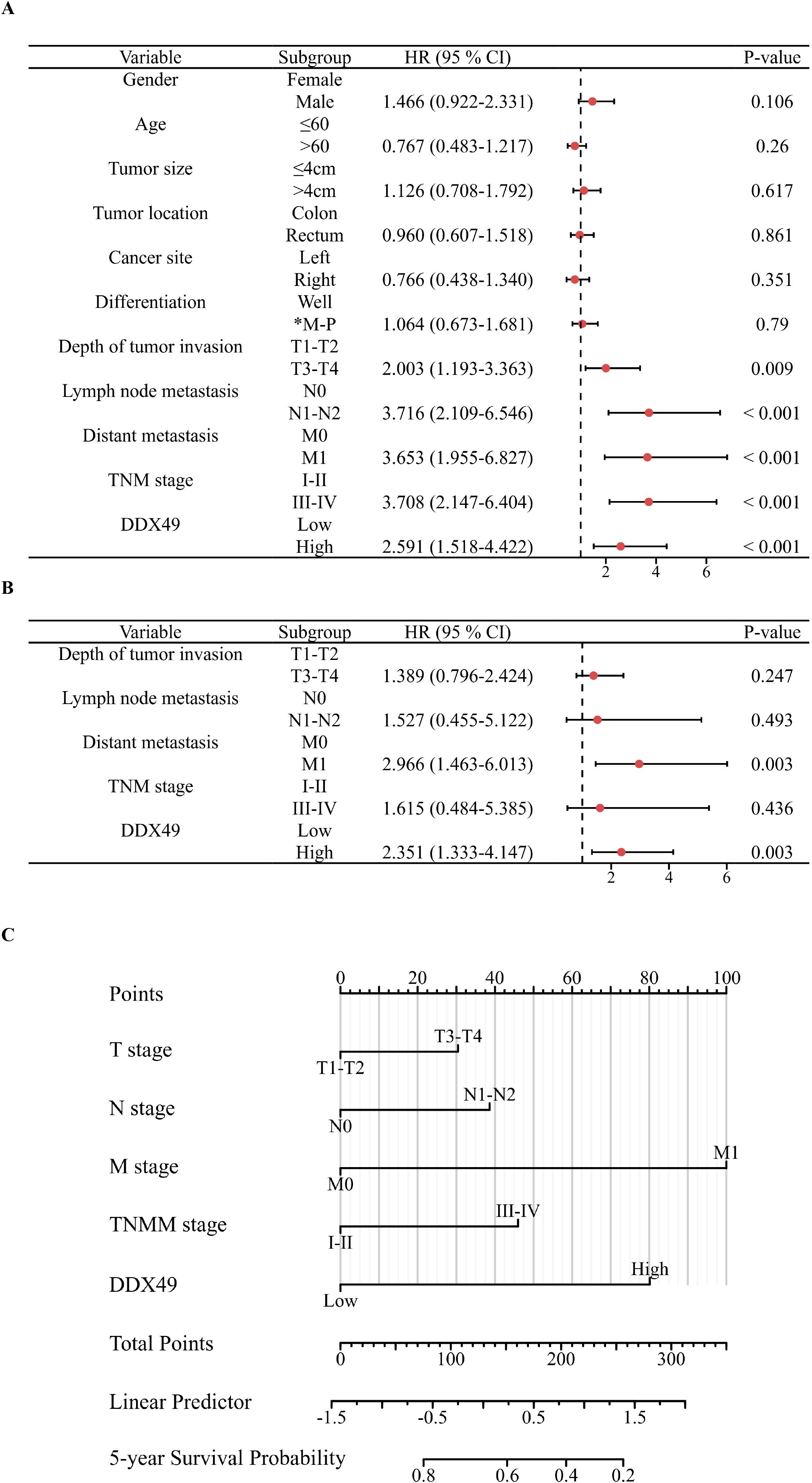 Subsequently, a prognostic forest plot was generated to visualize the magnitude of the impact of risk factors in the Cox regression analysis results. In the forest plots, DDX49 was identified as a prognostic risk factor in both univariate and multivariate analyses (Figures 4A, B, Table 3). Then, a nomogram was constructed incorporating five variables: T stage, N stage, M stage, TNM stage, and DDX49 expression. Each variable was assigned a specific score based on its respective value, with higher total scores indicating lower 5-year survival probabilities. The results revealed that patients with high DDX49 expression exhibited a poorer prognosis, with a lower predicted 5-year survival rate (Figure 4C).