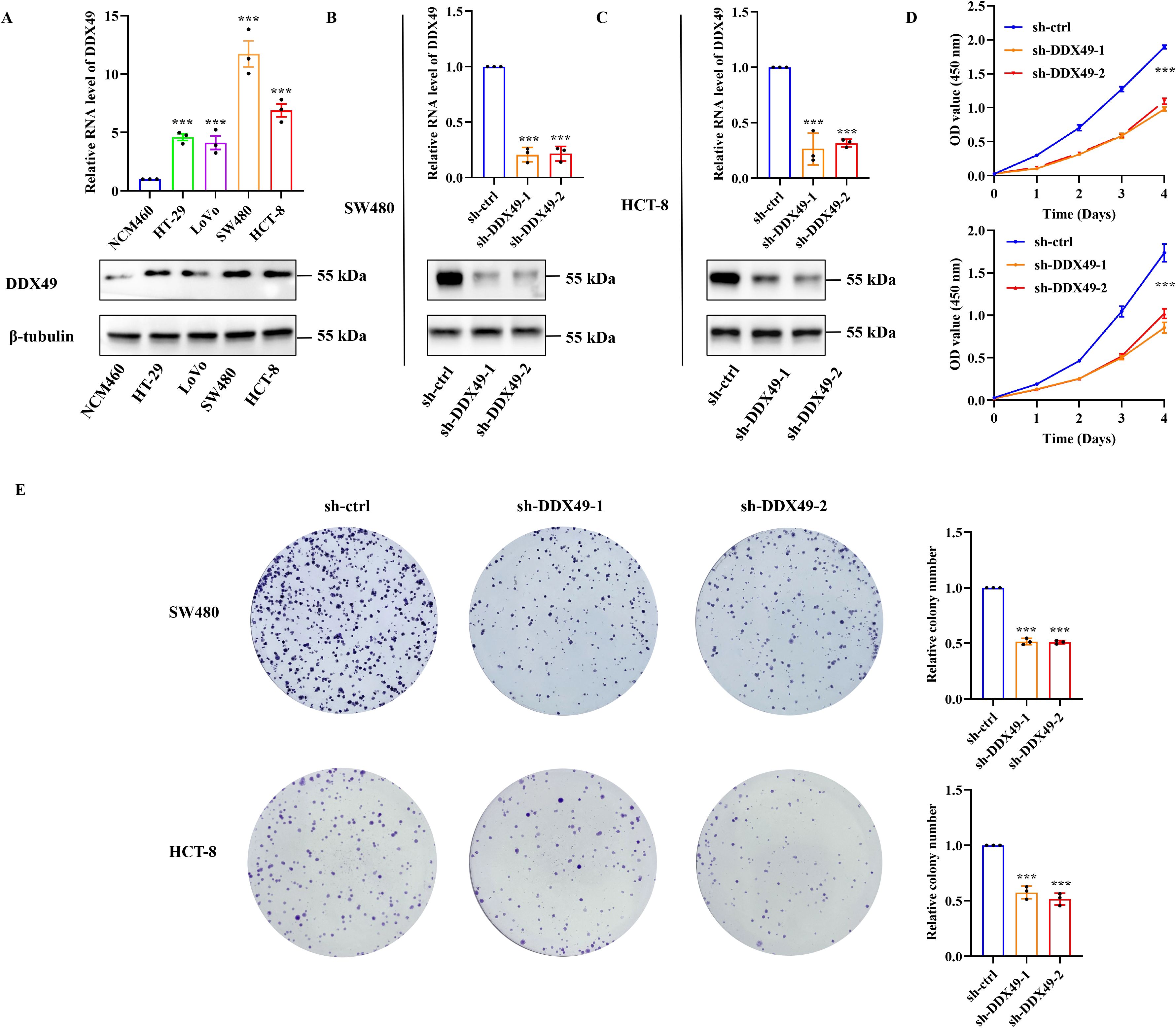 Figure 5. Knockdown of DDX49 significantly inhibited the proliferative capacity of CRC cells in vitro. (A) Detection of DDX49 expression levels in CRC cells (upper: RT-qPCR, lower: WB). (B, C) Validation of knockdown efficiency in DDX49 stably knocked-down cells (left: in SW480, right: in HCT-8). (D) Changes in the proliferative activity of CRC cells detected by CCK-8 assay at 0, 1, 2, 3, and 4 days after DDX49 knockdown. (E) Representative images of colony formation assay results and bar chart of quantitative analysis of colony-forming efficiency. All experiments were independently repeated at least three times. *P ≤ 0.05, **P ≤ 0.01, ***P ≤ 0.001, and ns, not significant.