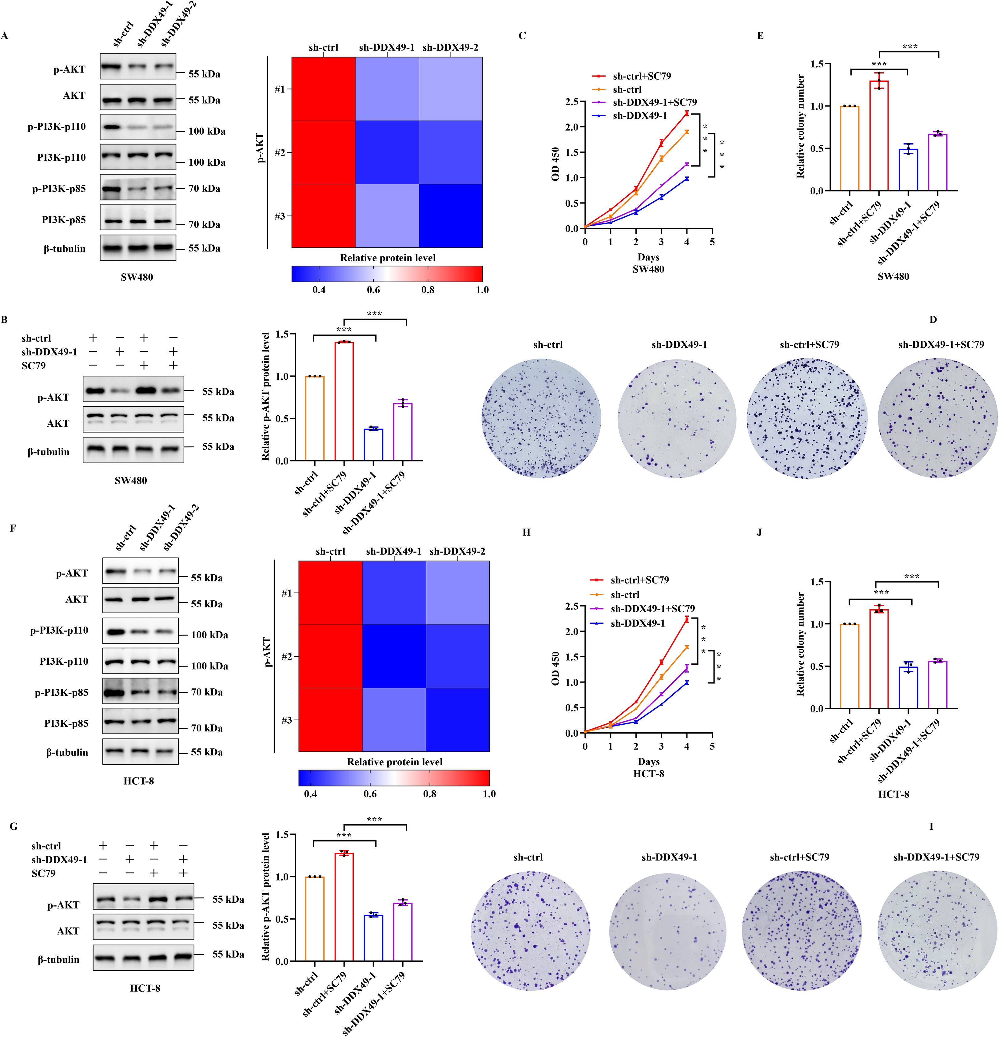 Figure 6. Knockdown of DDX49 led to decreased phosphorylation of the PI3K-AKT pathway in cancer cells. (A) Western blot analysis of key PI3K-AKT pathway components in SW480 cells. Left panel (bottom to top, representing molecular weight from high to low): PI3K-p85, p-PI3K-p85, PI3K-p110, p-PI3K-p110, AKT, p-AKT. Right panel: Phosphorylation heatmap. (B) Effects of SC79 treatment on AKT phosphorylation in SW480 cells. (C) CCK-8 assay measuring cell proliferation in SC79-treated SW480 cells. (D, E) Colony formation assays in SW480 cells following SC79 treatment. (F) Western blot analysis of PI3K-AKT pathway proteins in HCT-8 cells. (G) AKT phosphorylation changes in HCT-8 cells treated with SC79. (H) CCK-8-based cell proliferation analysis in SC79-treated HCT-8 cells. (I, J) Colony formation ability of HCT-8 cells following SC79 treatment. All experiments were independently repeated at least three times. *P ≤ 0.05, **P ≤ 0.01, ***P ≤ 0.001, and ns, not significant.