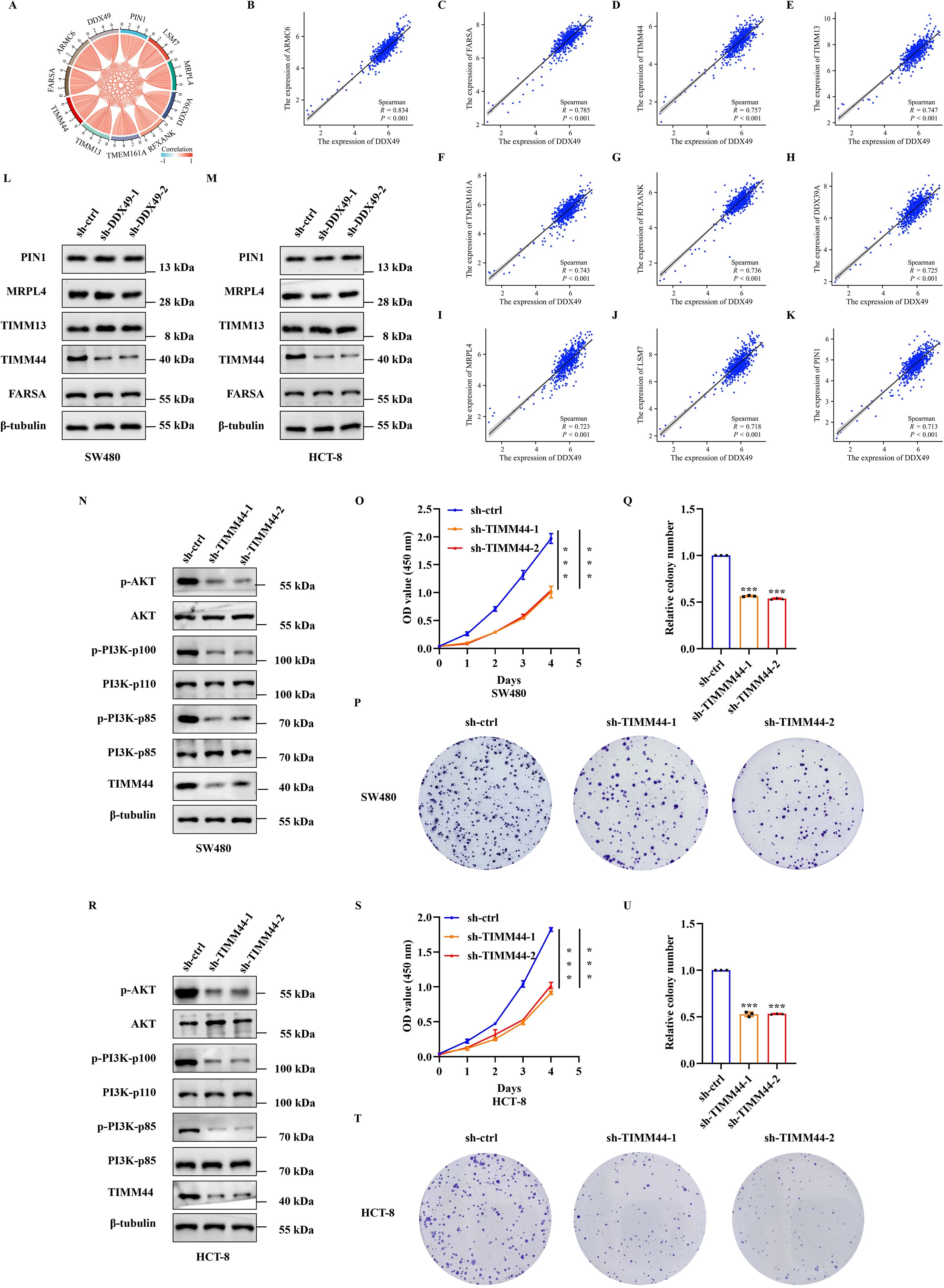 Figure 7. DDX49 could affect the expression of TIMM44 in CRC cells. (A) A chord diagram of the top 10 genes correlated with DDX49, screened from the TCGA database in CRC. (B-K) Scatter plots of correlations between DDX49 and the ten related genes (From B to K, these genes are as follows: ARMC6, FARSA, TIMM44, TIMM13, TMEM161A, RFXANK, DDX39A, MRPL4, LSM7, and PIN1). (L) WB analysis validating differential expression of the five DDX49-correlated genes post-knockdown in SW480 cells. (M) WB analysis validating differential expression of the five DDX49-correlated genes after knockdown in HCT-8 cells. (N) WB assessing PI3K-AKT pathway protein alterations following TIMM44 knockdown in SW480 cells. (O) CCK-8 assay results demonstrating the effect of TIMM44 knockdown on SW480 cell proliferation. (P-Q) Effect of TIMM44 knockdown on cell colony formation in SW480 cells (P: Stained colony images; Q: Statistical analysis of colony formation efficiency). (R) WB assessing PI3K-AKT pathway protein alterations following TIMM44 knockdown in HCT-8 cells. (S) CCK-8 assay results demonstrating the effect of TIMM44 knockdown on HCT-8 cell proliferation. (T-U) Effect of TIMM44 knockdown on cell colony formation in HCT-8 cells. All experiments were independently repeated at least three times. *P ≤ 0.05, **P ≤ 0.01, ***P ≤ 0.001, and ns, not significant.