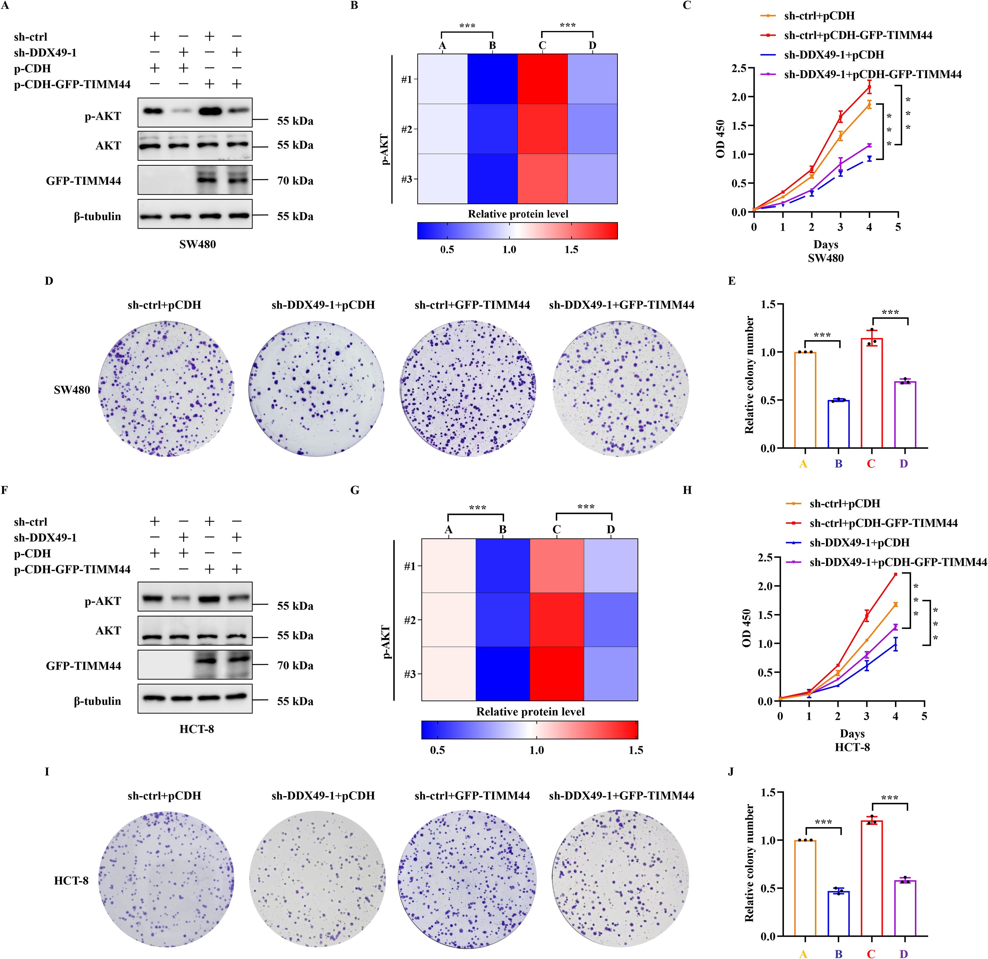 Figure 8. The rescue effect of TIMM44 overexpression on AKT phosphorylation and proliferation phenotype in DDX49-knockdown tumor cells. (A, B) WB results and quantitative analysis of phosphorylated AKT (Ser473) and total AKT in different cell groups of SW480. The experimental groups were as follows: sh-ctrl+pCDH (labeled as A in Figure 8B), sh-DDX49-1+pCDH (labeled as B), sh-ctrl+pCDH-GFP-TIMM44 (labeled as C), and sh-DDX49-1+pCDH-GFP-TIMM44 (labeled as D). (C) CCK-8 assay showing cell proliferation activity curves of each group over 0–4 days in SW480 cells. (D, E) Representative crystal violet staining images and clone count statistics from the colony formation assay in SW480 cells. (F, G) WB results and quantitative analysis of phosphorylated AKT (Ser473) and total AKT in HCT-8 cells (labels A-D in Figure 8G correspond to those in Figure 8B). (H) CCK-8 assay showing cell proliferation activity curves of each group in HCT-8 cells. (I, J) Representative crystal violet staining images and clone count statistics from the colony formation assay in HCT-8 cells. All experiments were independently repeated at least three times. *P ≤ 0.05, **P ≤ 0.01, ***P ≤ 0.001, and ns, not significant.